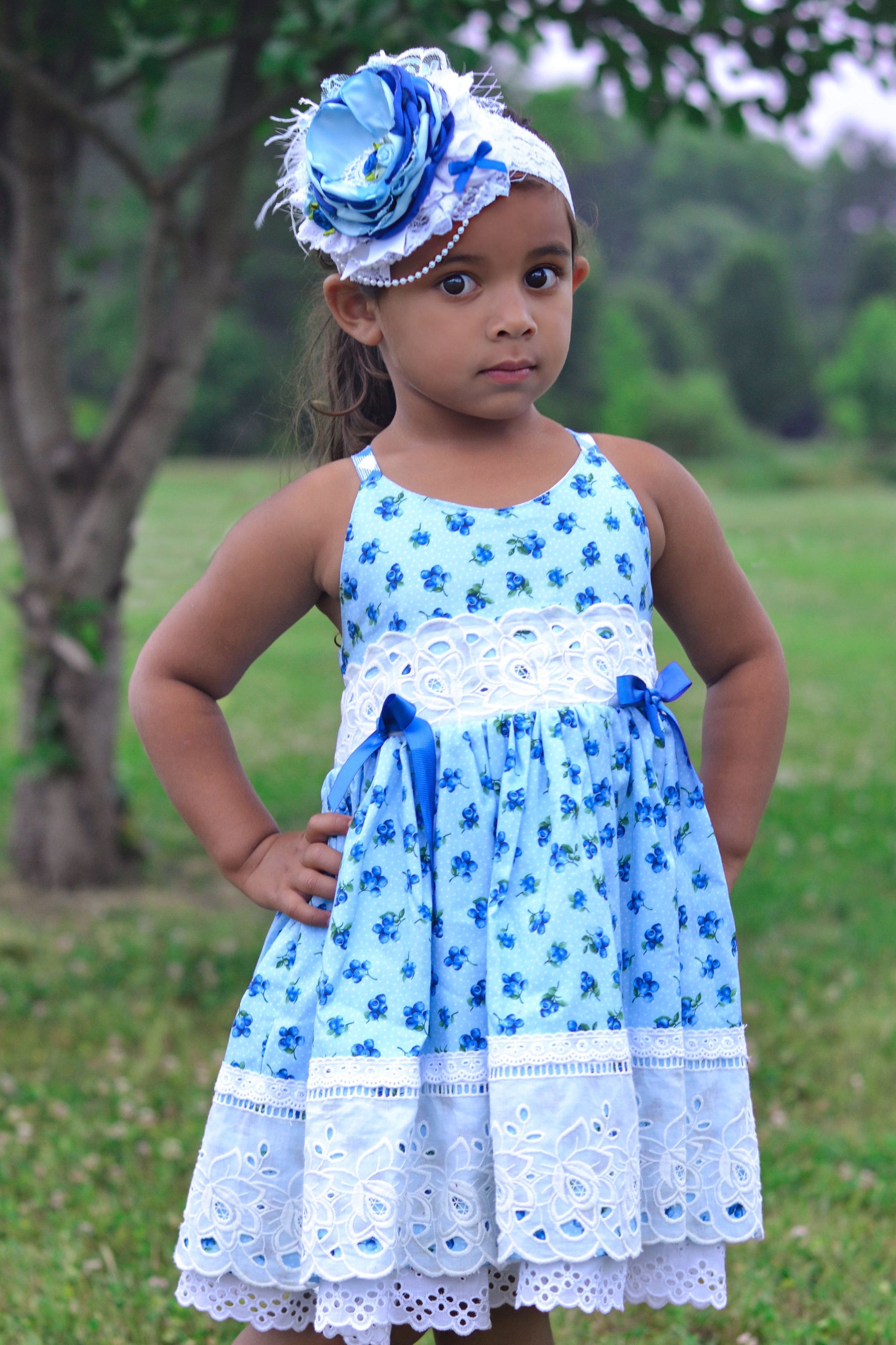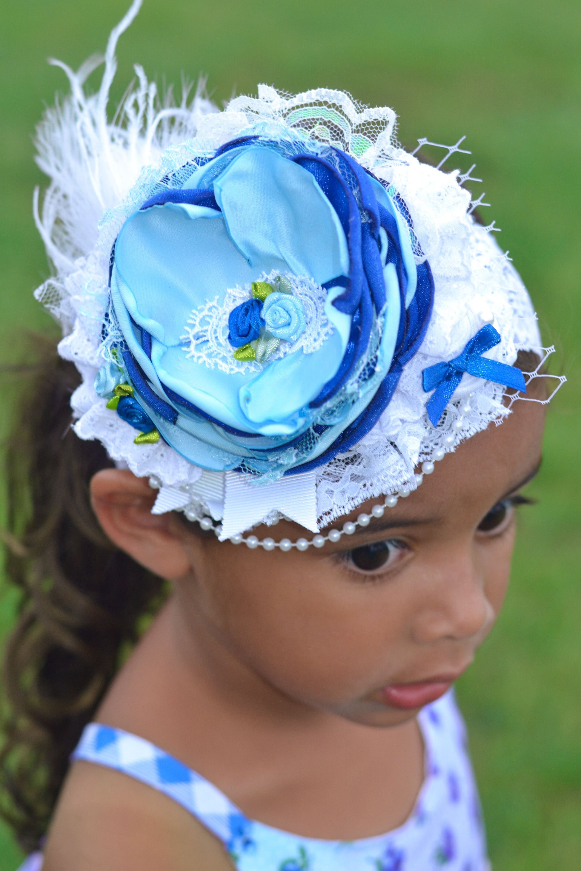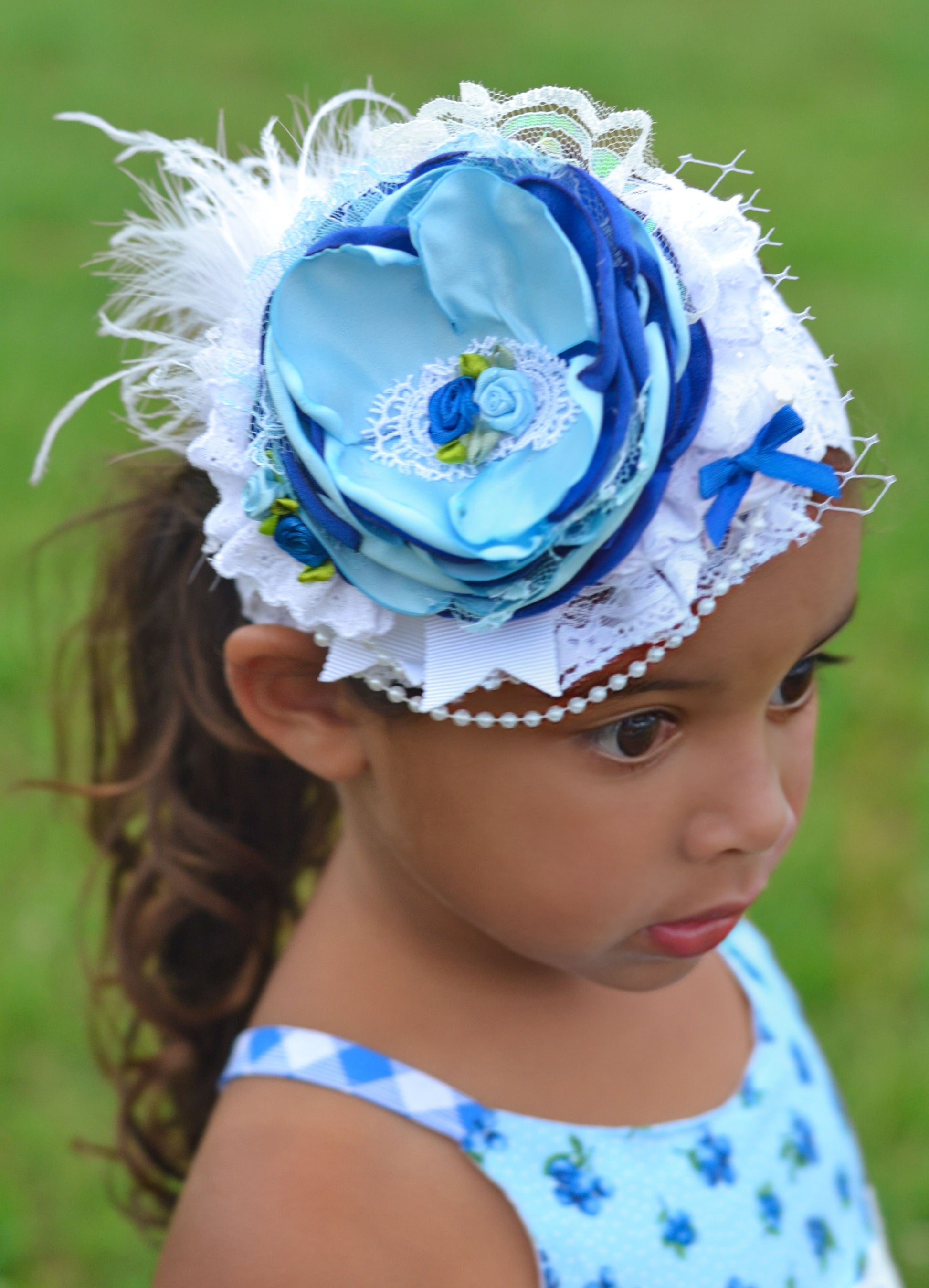 Medium size (4.5") petals of satin fabric, with 2 shades blue and white lace layers. This open style bloom that has rosettes in the center, white feathers, lace ruffles, strand pearls, and rolled rosettes. Pictured on a lace headband but can be on a hard band, nylon band, elastic band, or clip.