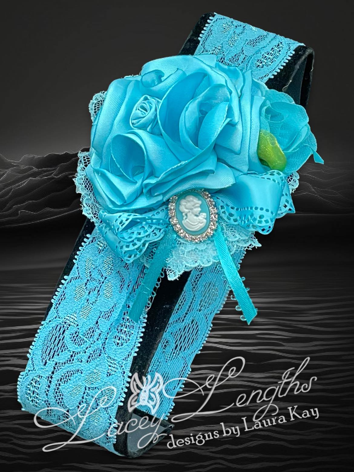 Hand made singed, satin blooms (3.5" petals pictured) with pearl accents and a chiffon rose, ribbons and coordinating cameo with rhinestones. Available as piggie set on alligator clips or a single bloom on a lace band, either small (3.5" petals) or itty-bitty (2.5" petals).