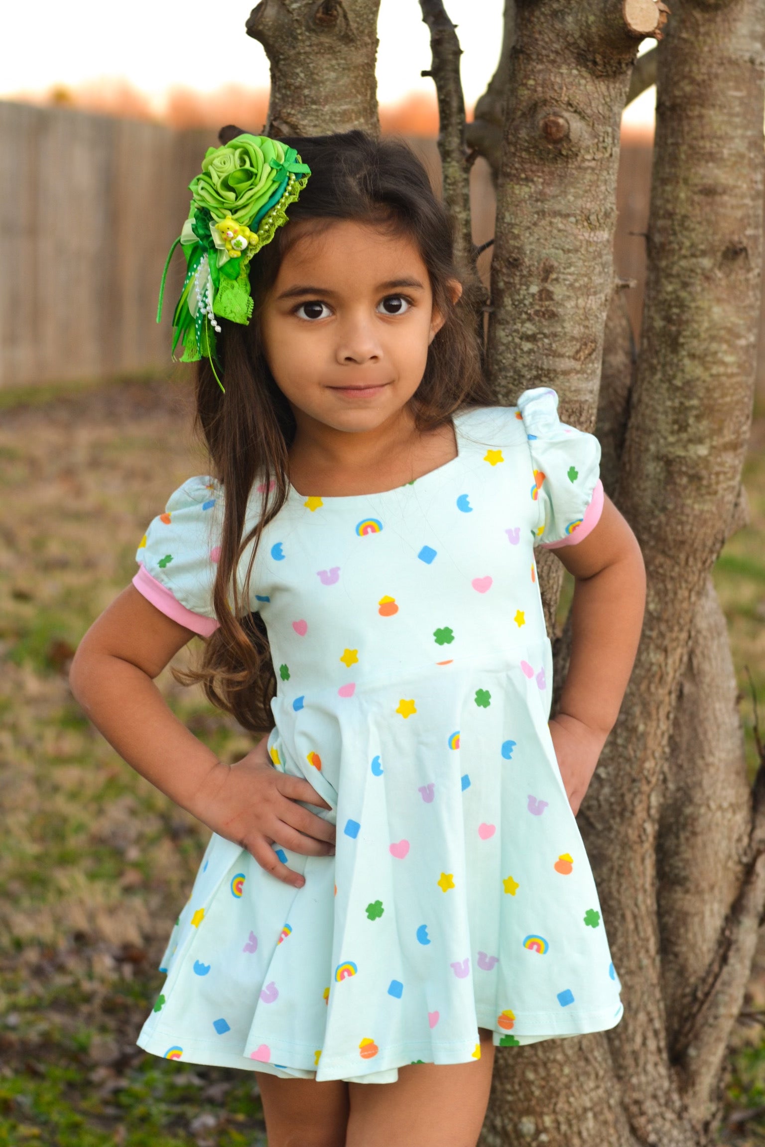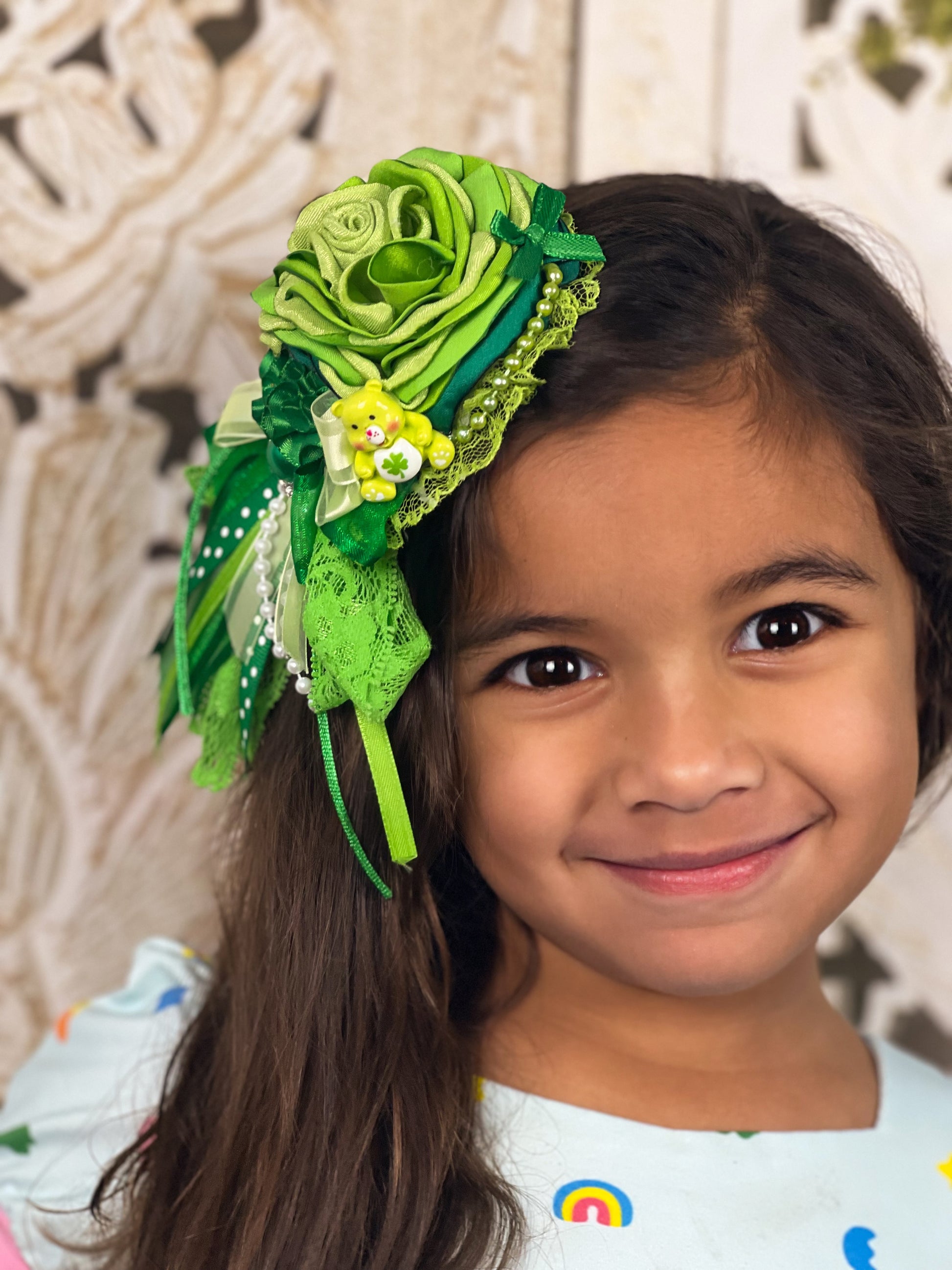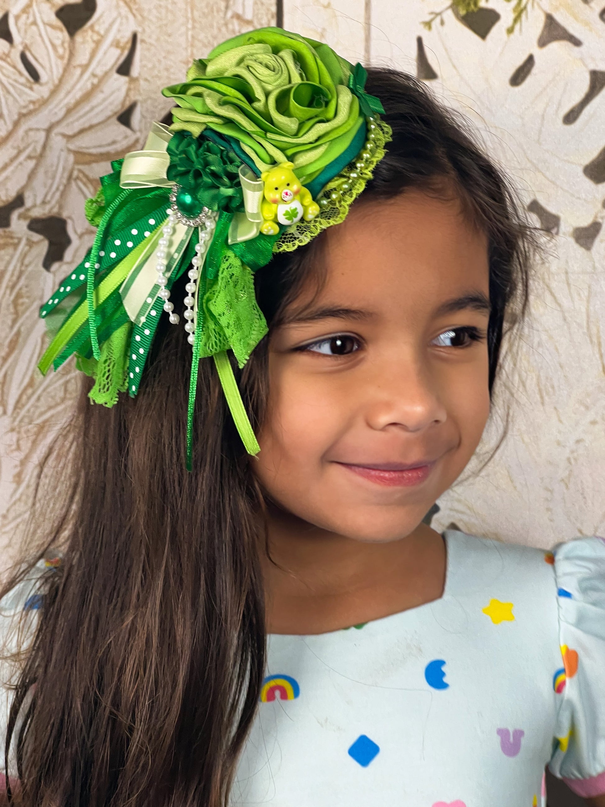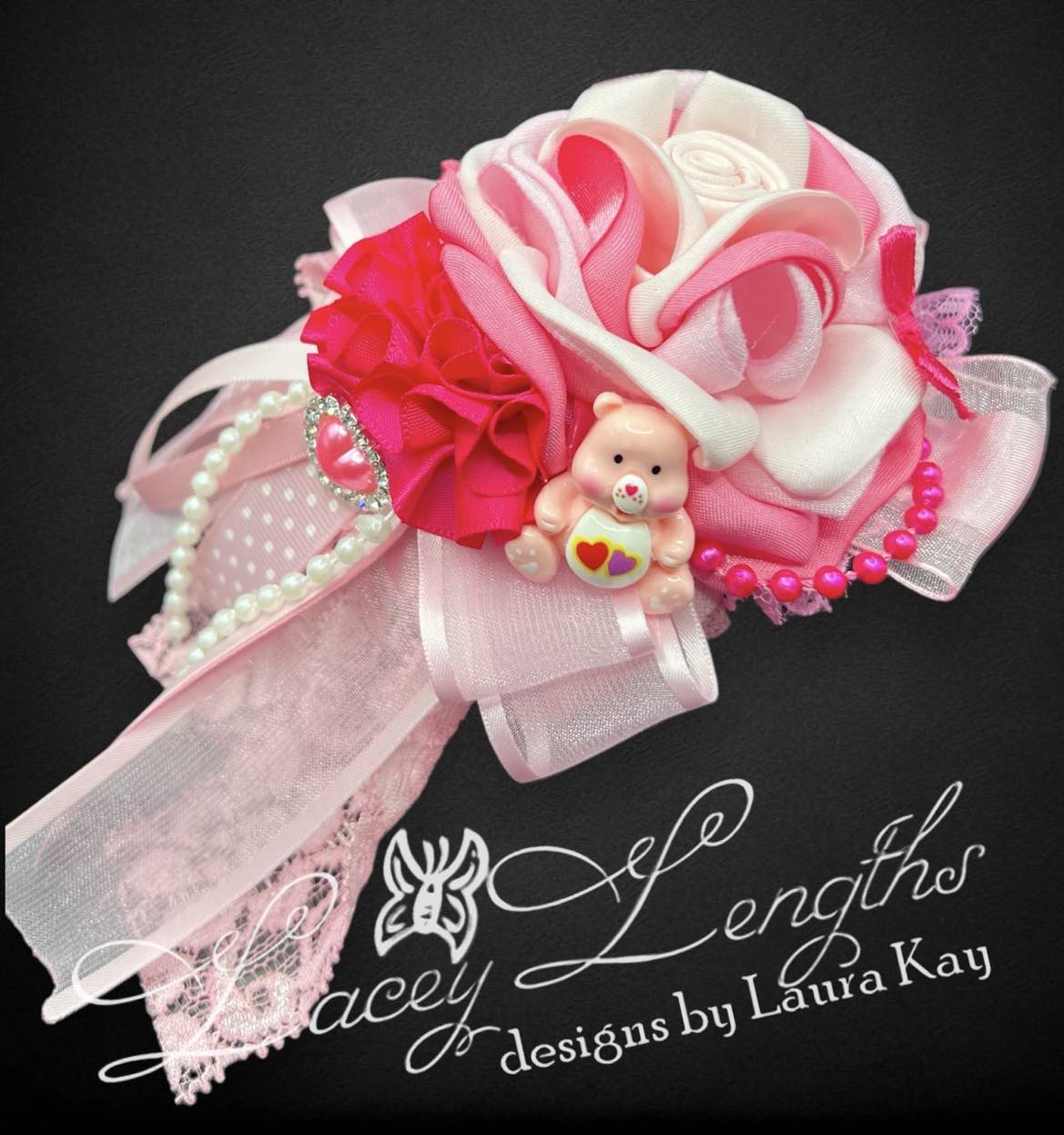 Small size (3.5") bloom made with multiple shades of satin fabric. This rosebud center style bloom sits atop color coordinating lace and is dressed with rhinestones and matching pearls, ribbon, and a Care Bear!