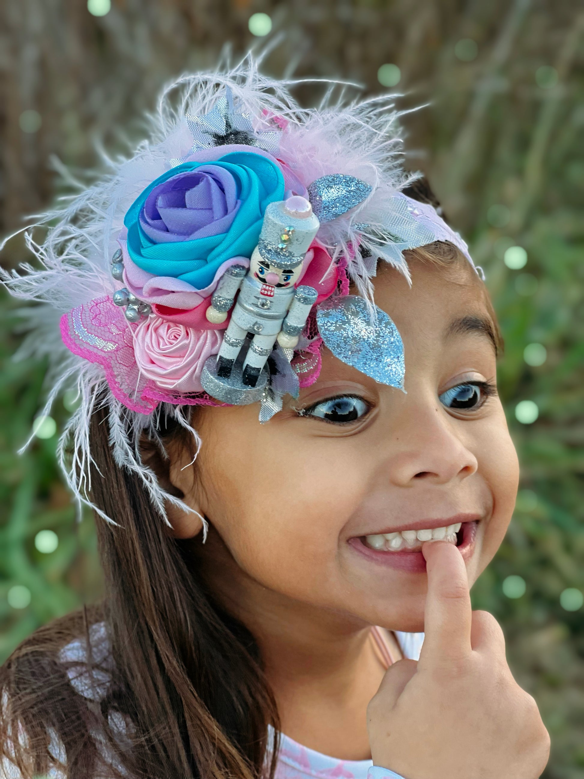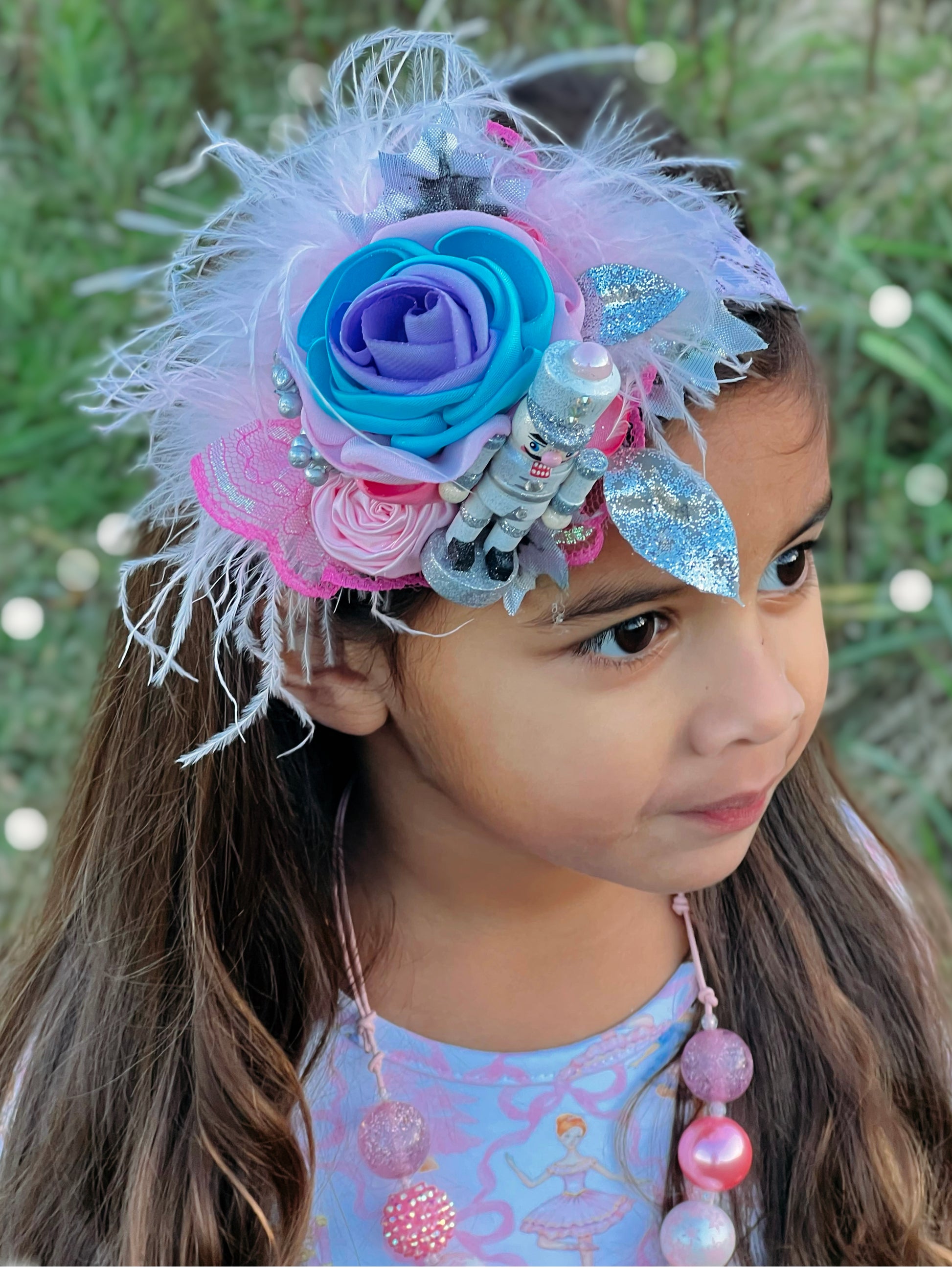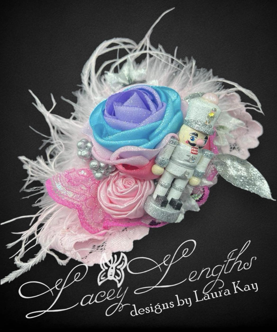 Small size (3.5") petals layered pink, soft pink, Spa Blue and Lavender satin fabric, covered in glitter. This 'stacked' style bloom is adorned with a pink rolled rosette, pink iridescent lace ruffle, white feathers, and glitter silver florals. On the side is a white and silver glitter nutcracker.