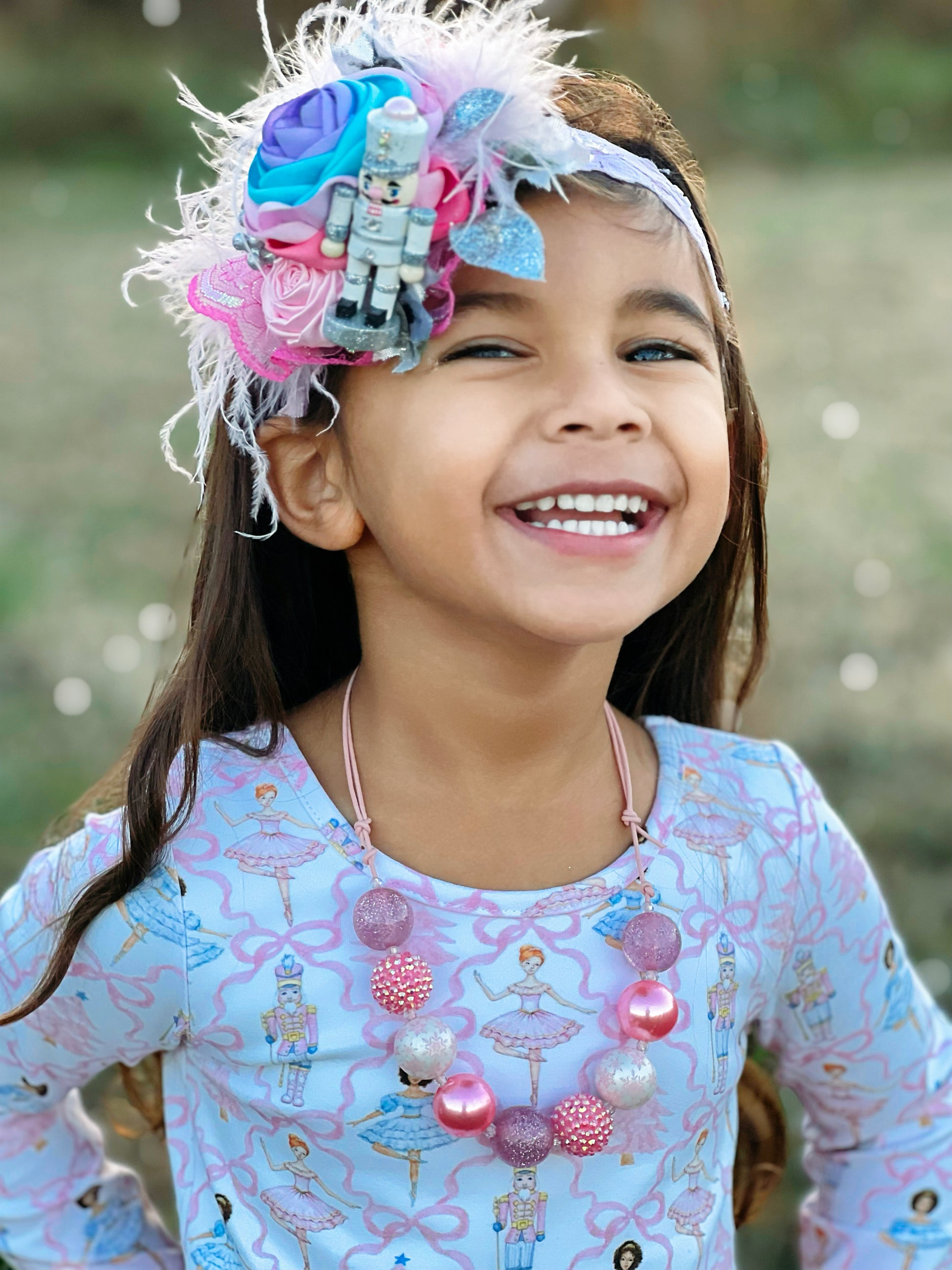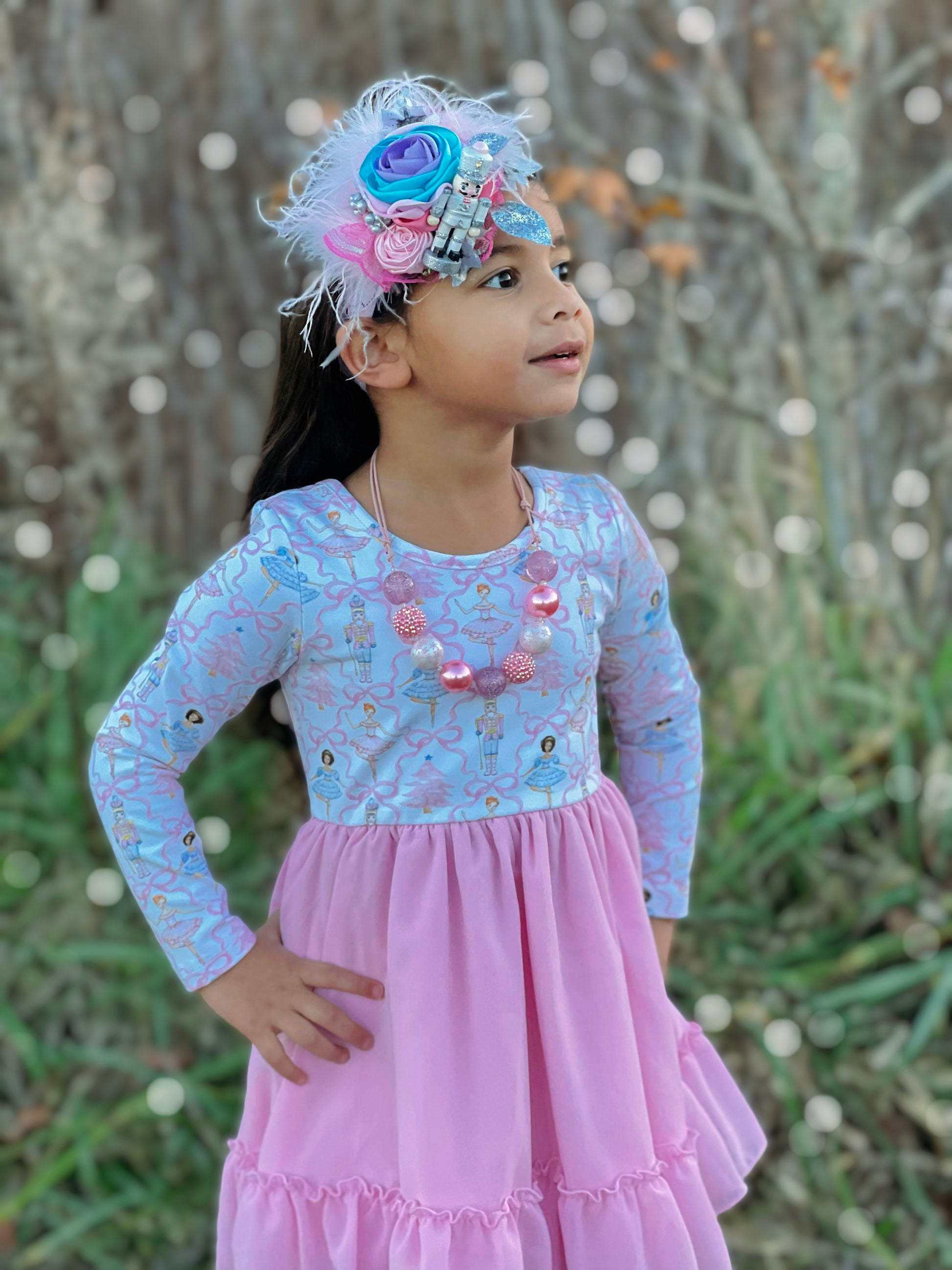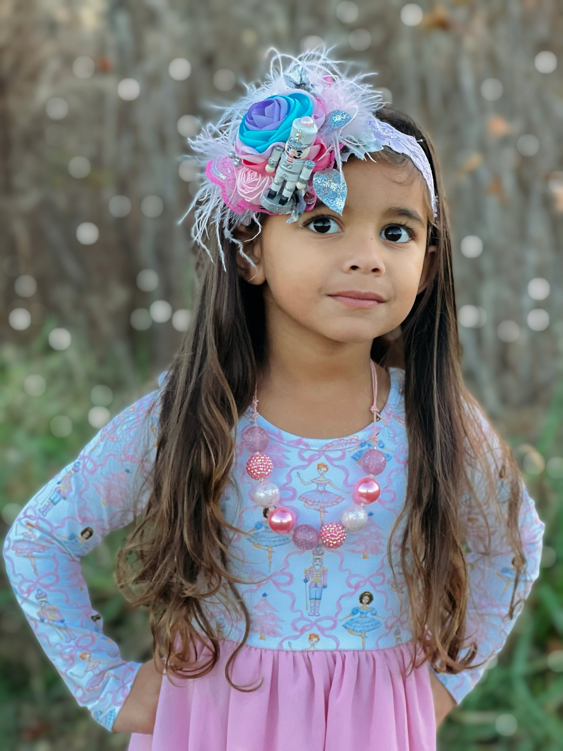Small size (3.5") petals layered pink, soft pink, Spa Blue and Lavender satin fabric, covered in glitter. This 'stacked' style bloom is adorned with a pink rolled rosette, pink iridescent lace ruffle, white feathers, and glitter silver florals. On the side is a white and silver glitter nutcracker.