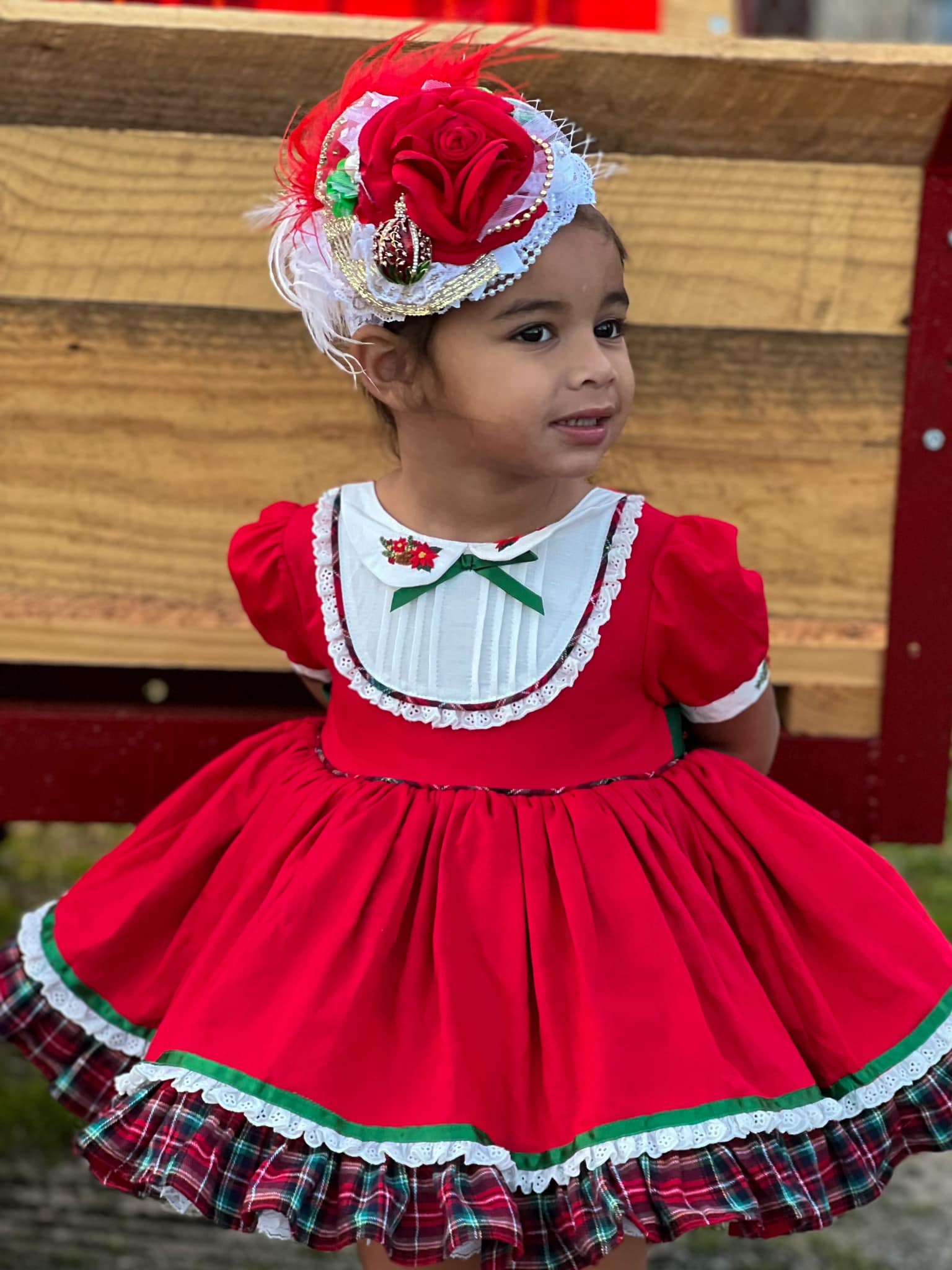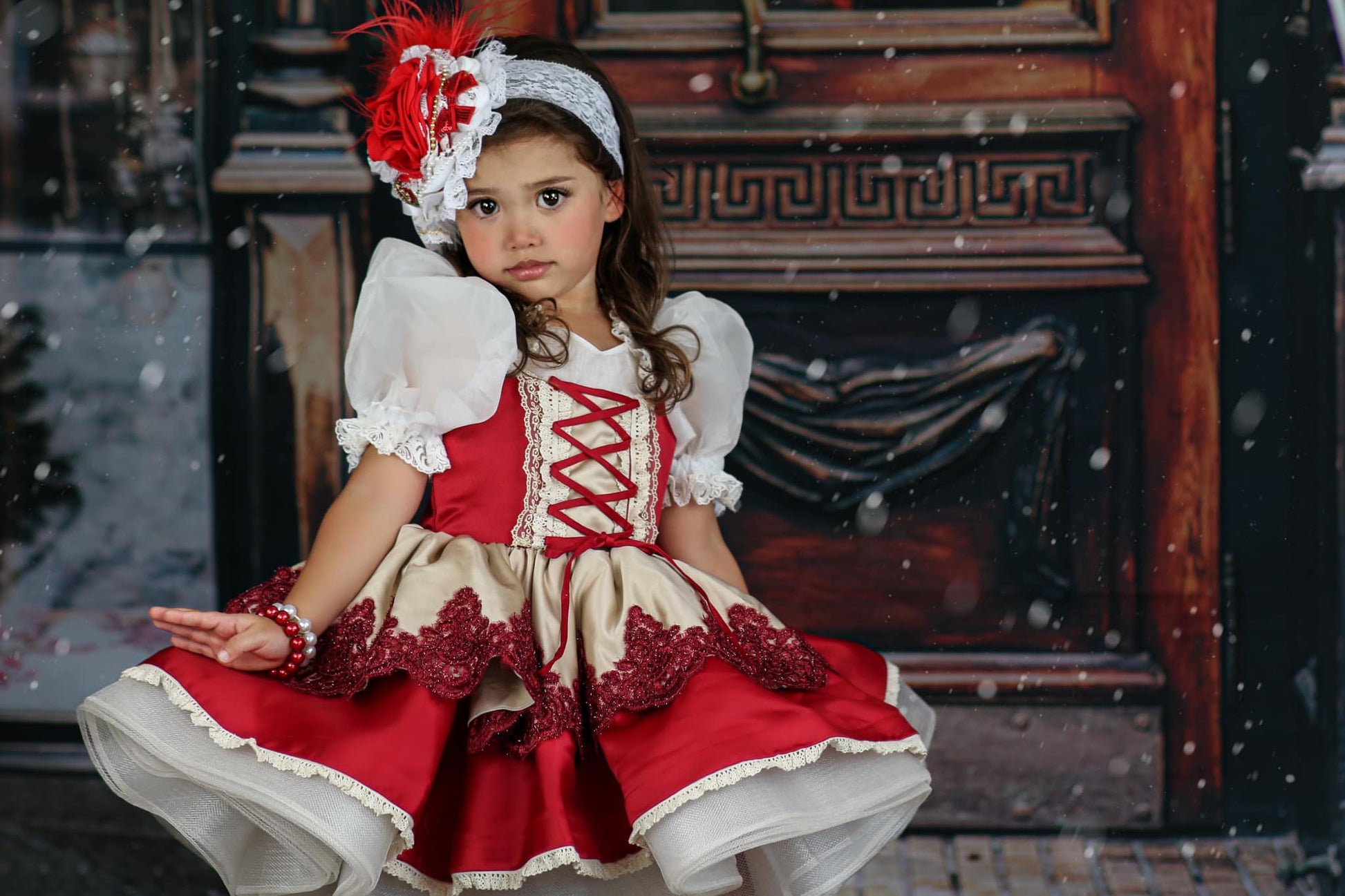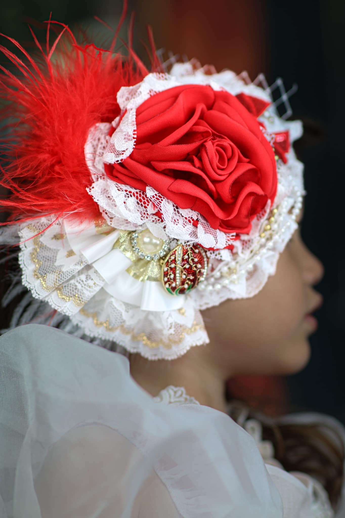 This screams Christmas, a Christmas Red Med bloom, with some gold metallic foil accents on white lace, Red ostrich feathers and a rhinestone enamel Christmas ornament to set this piece off. Pictured on white lace headband but can be on a hard, nylon or elastic band as well as an alligator clip.