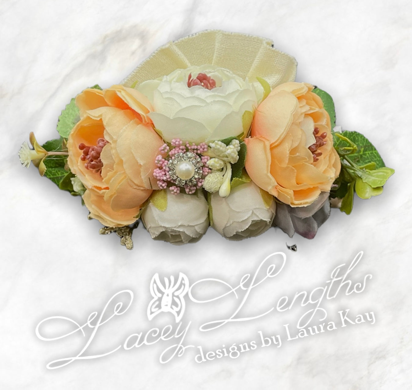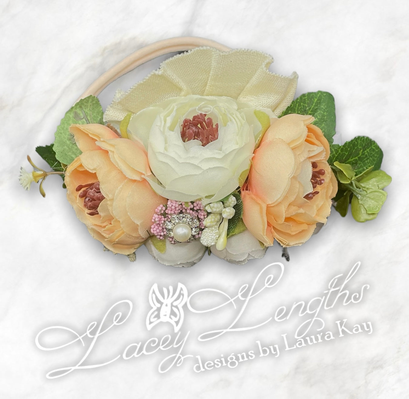 Silk florals with greenery leaves and rosettes, this is a very dainty and delicate look that you can match up with so many different outfits, just the right touch to dress up a simple outfit without going over board. It comes on a nylon band, you have your choice of either Aqua, milk white and a touch of a pink flower or a peachy/coral with milk white rosettes and a pearl rhinestone to give it a elegant look. Feathers added to finish this piece off.