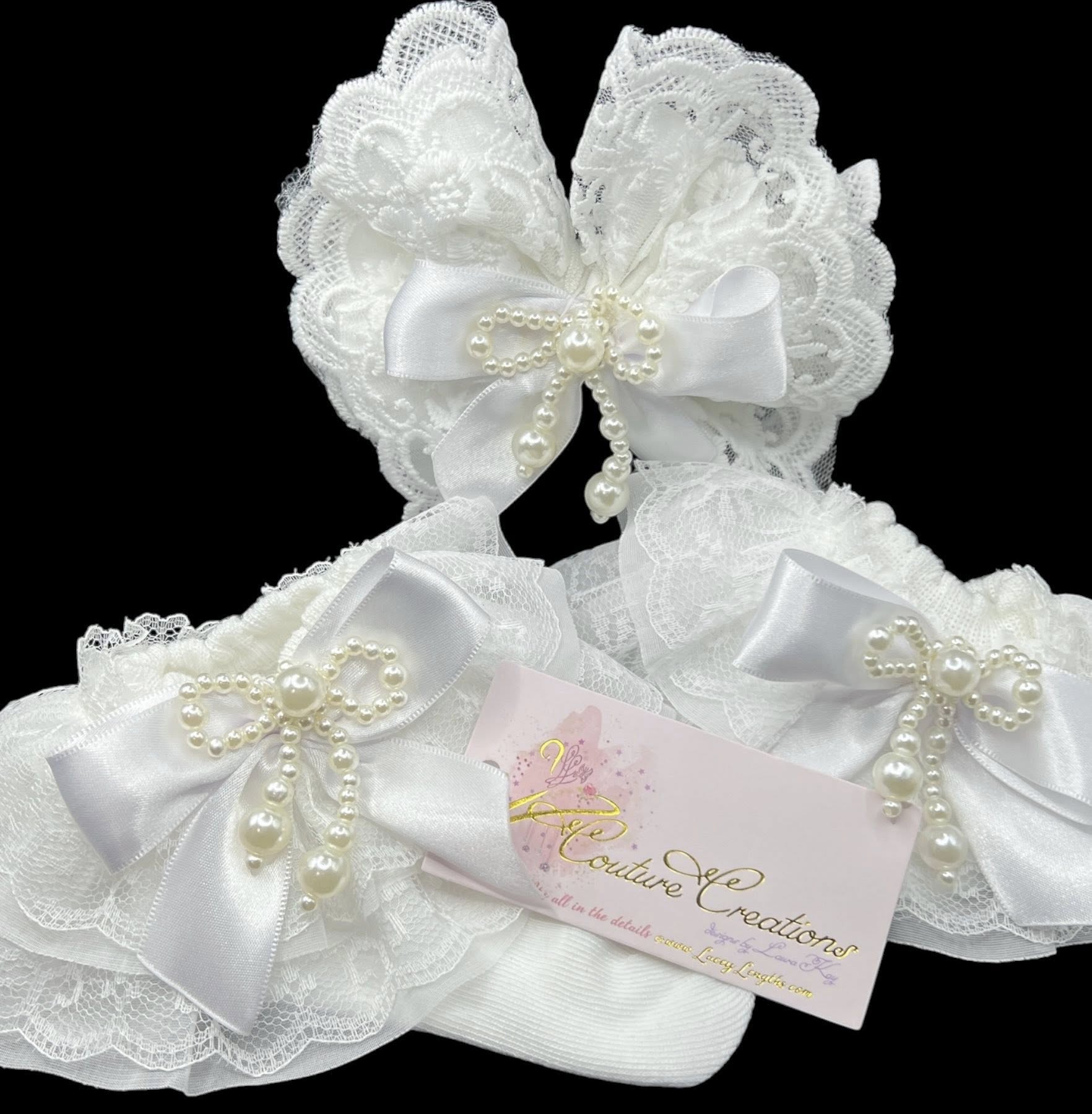 A pair of ruffled lace socks with a matching lace bow. Satin ribbon bow, embellishments may vary and can be customizable, your choice of hardware.