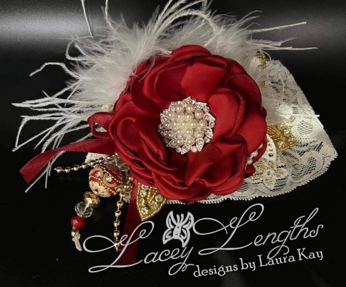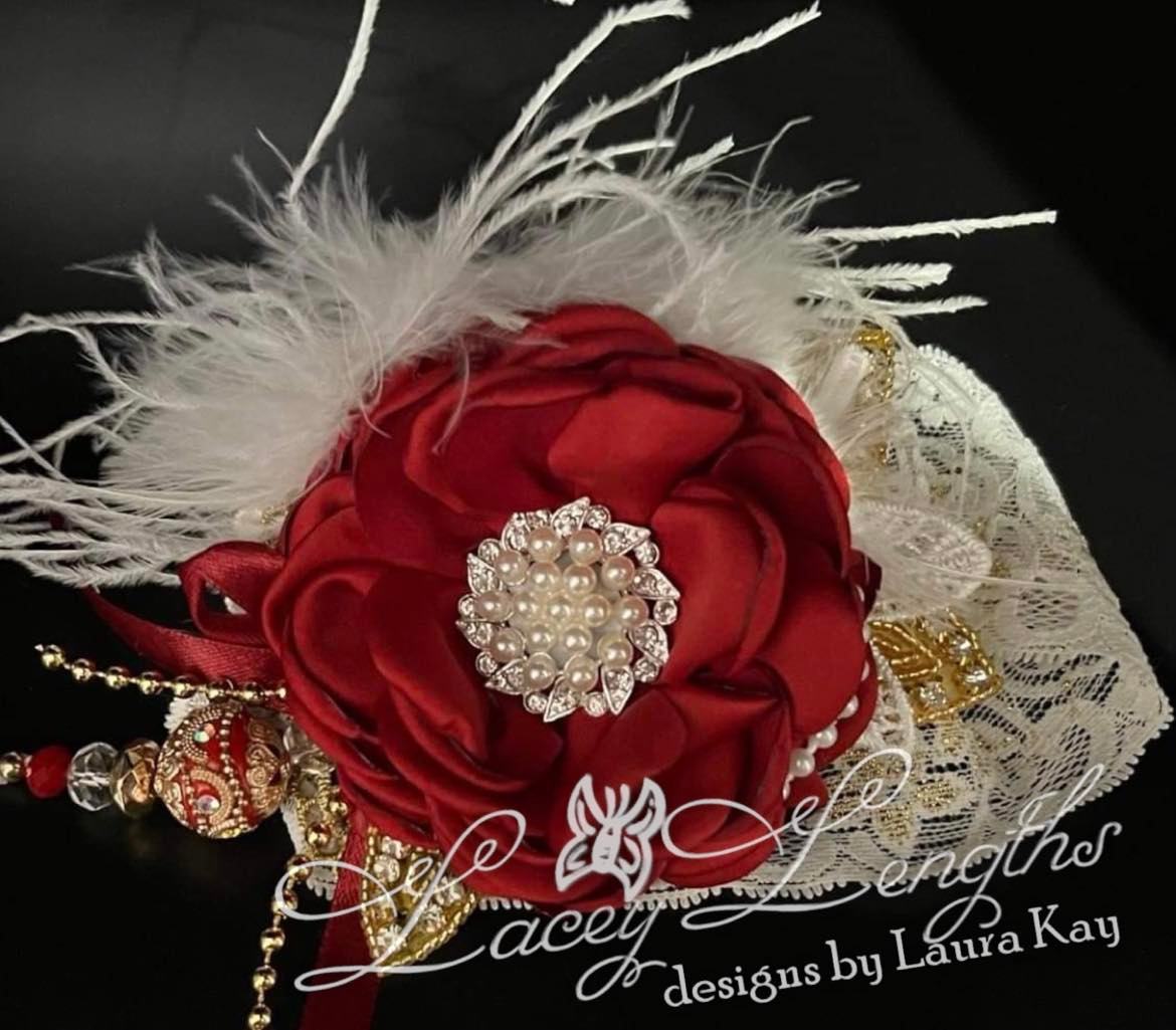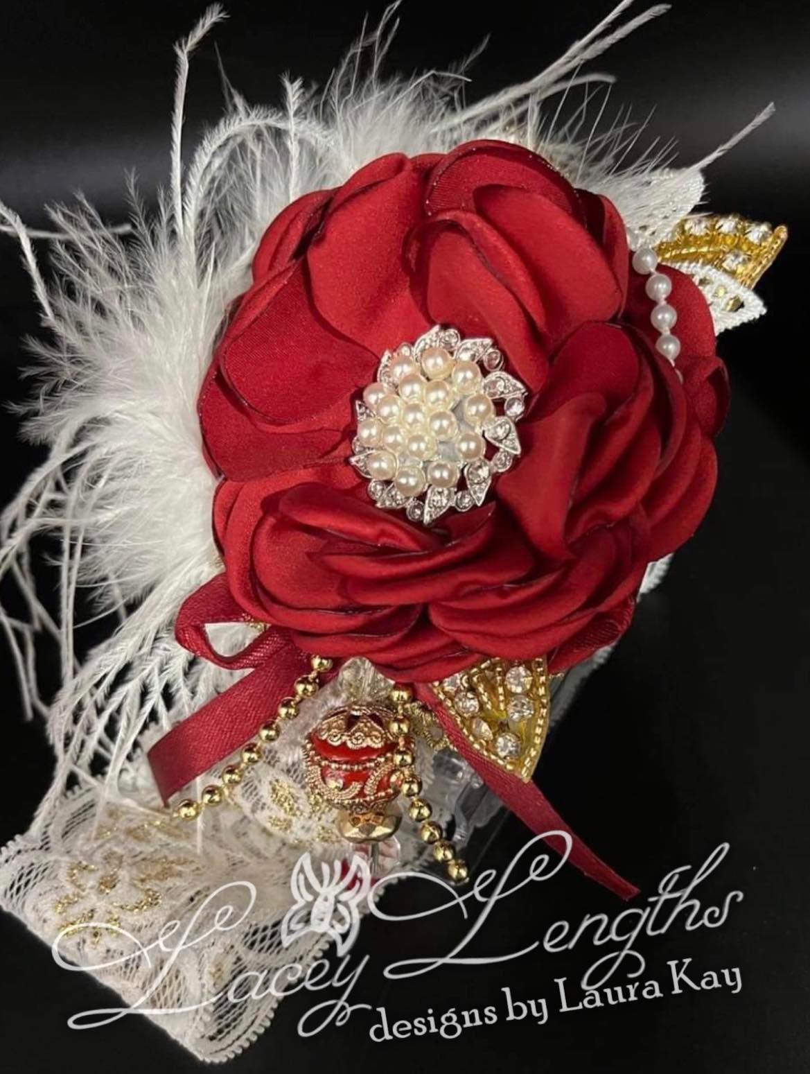 The style of this piece is very classic. Small size red bloom with a pearl cluster center, white feathers, rhinestone and beaded applique trim, gold lace, red ribbon bow, string pearls, and a strand of beads, all on a white and gold lace headband.