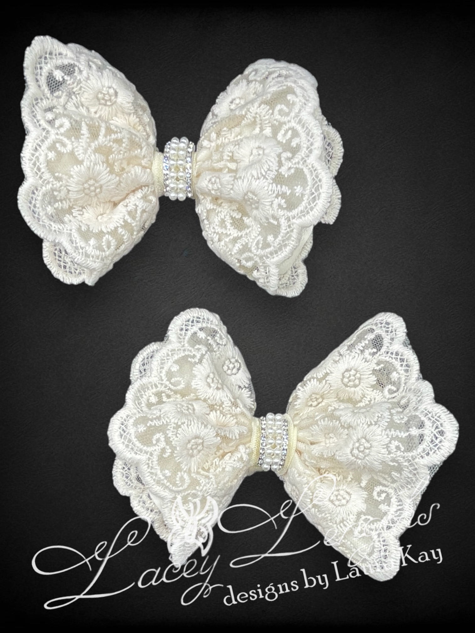 This design by Lacey Lengths was created for those that prefer pretty lacey bows. Embroidered lace bow with a lace overlay satin bow. Choice of 'bling' or Victorian rosette center. Available on a lace band, alligator clip, or elastic headband.