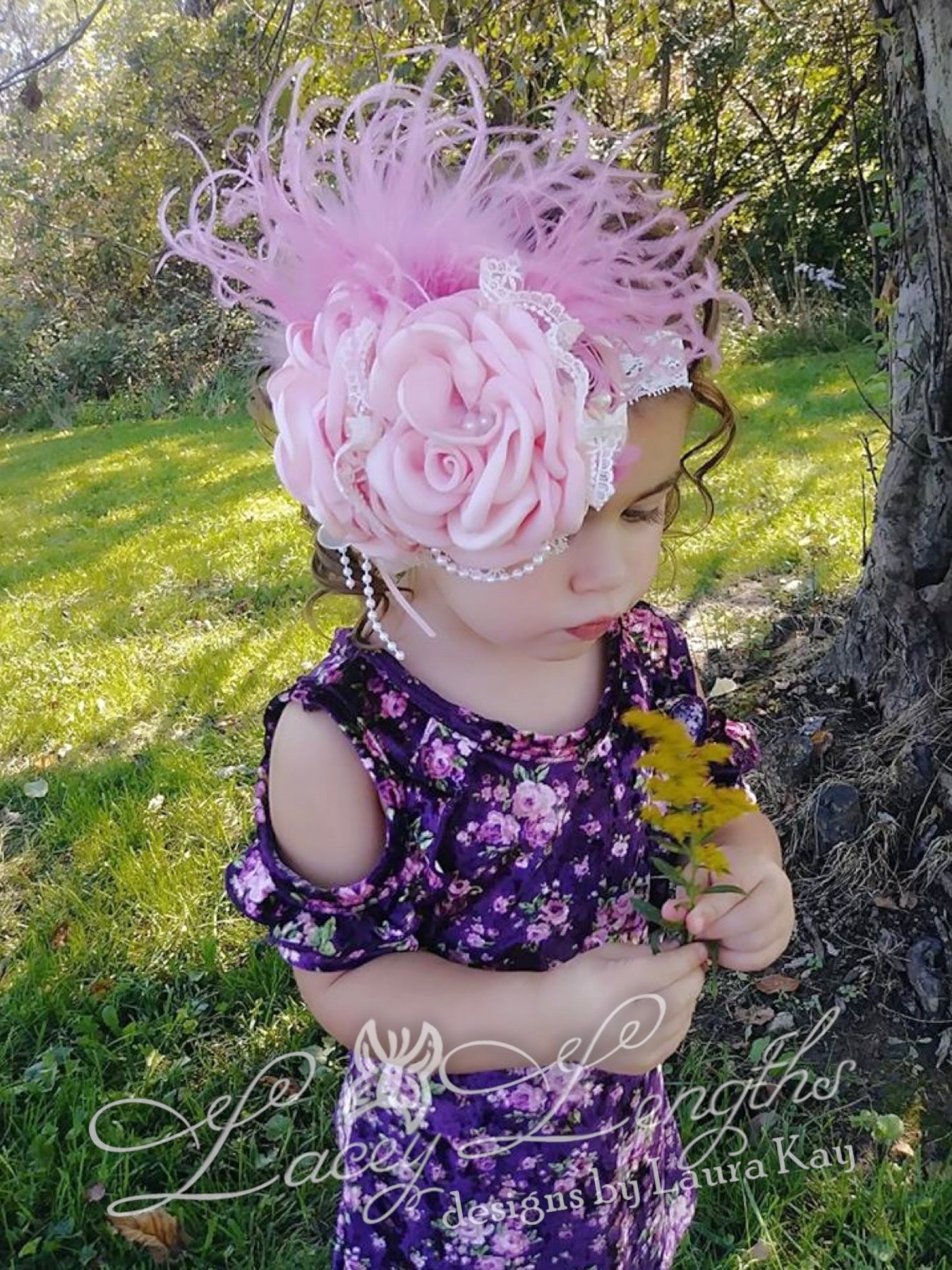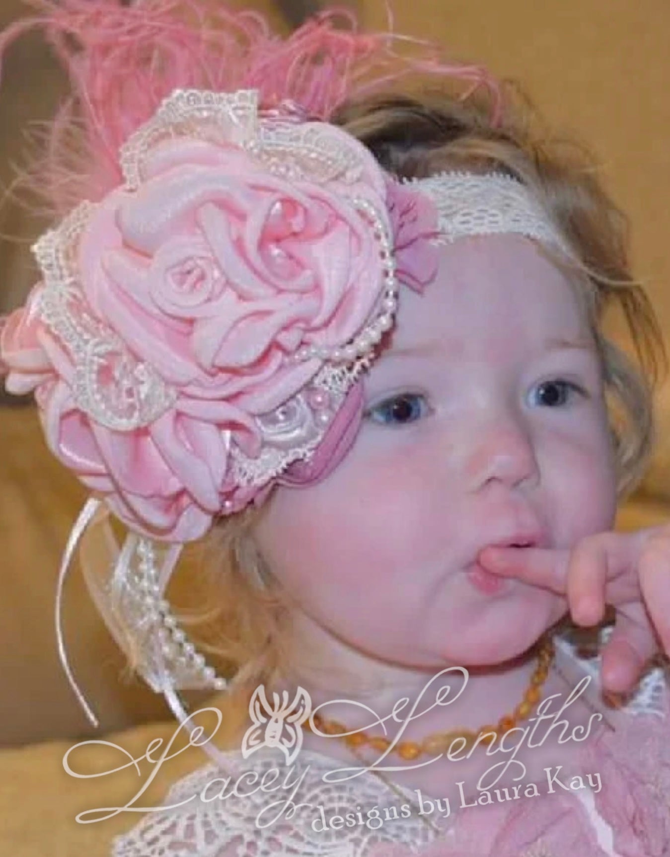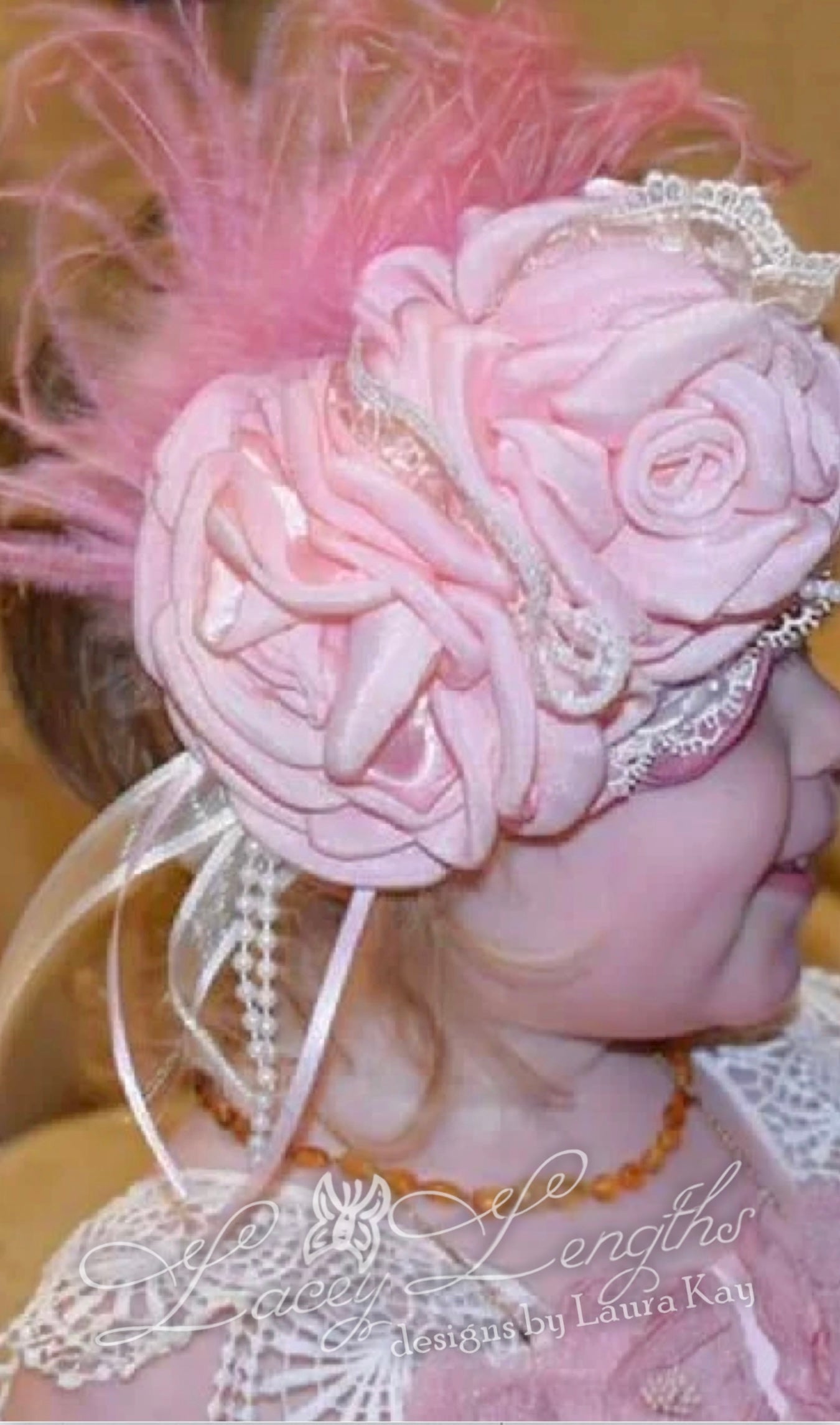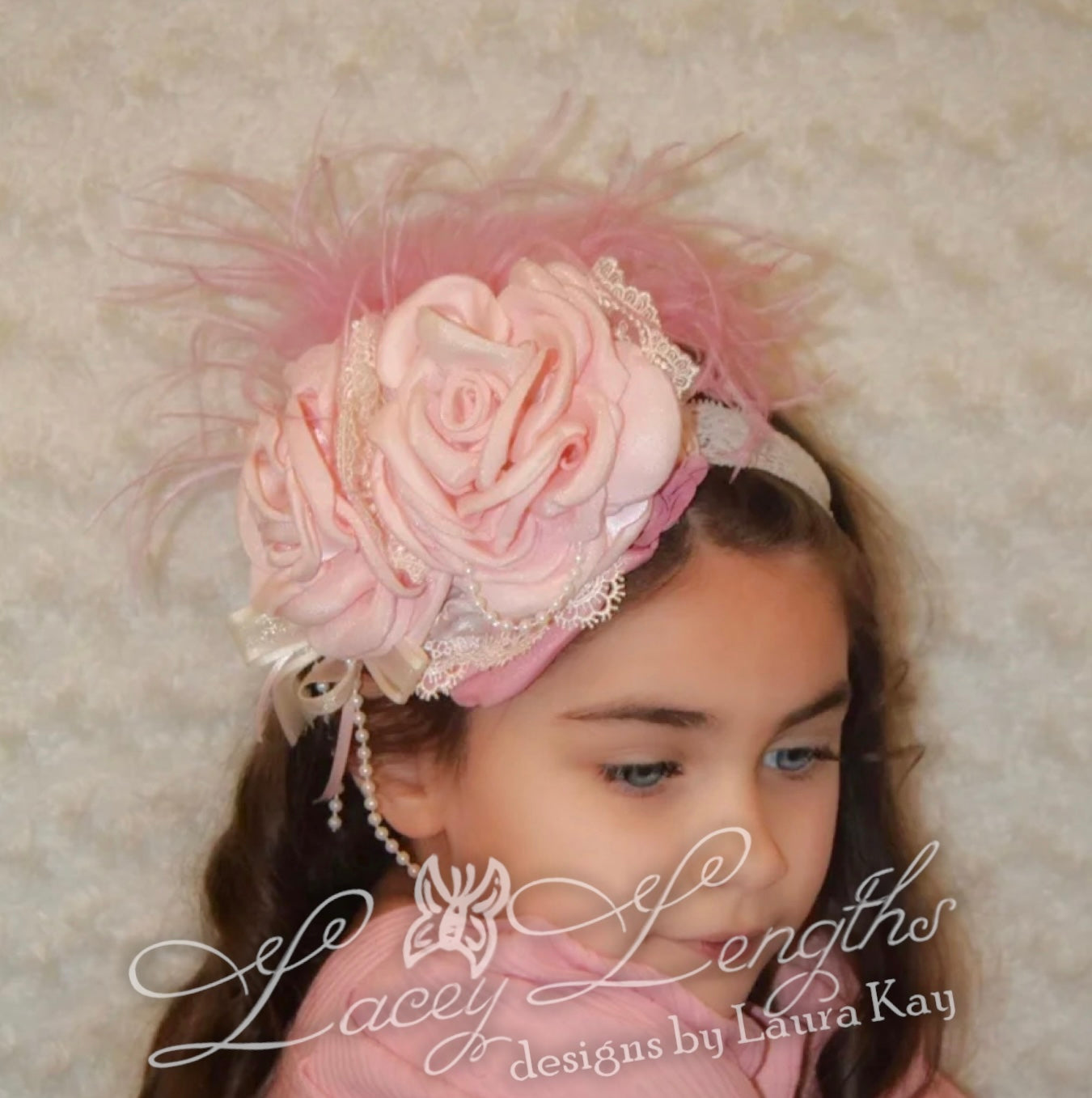 Porcelain has 2 hand dyed pink blooms, embellished with varieties of Ivory lace, pearls, ribbon, mauve ostrich feathers, rolled satin rose, chiffon rose on a lace band. This has details going on that you can not see it all with rhinestone and pearl details as well, embellishments may vary. Customizable :)
