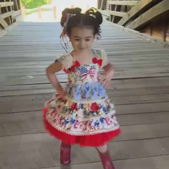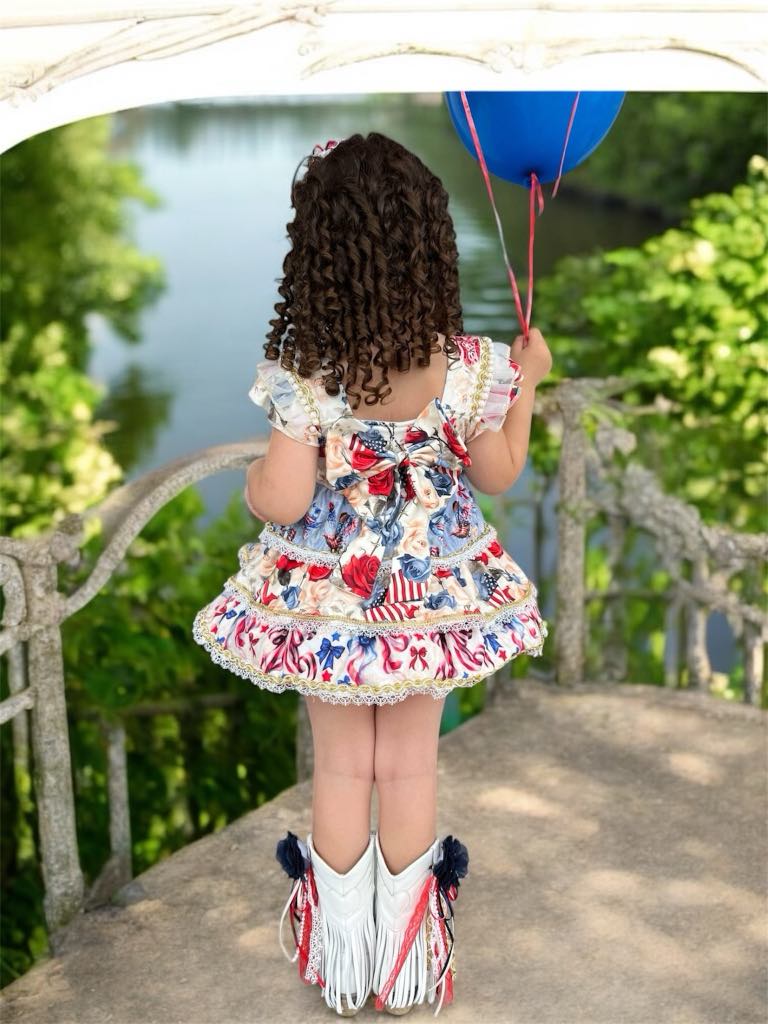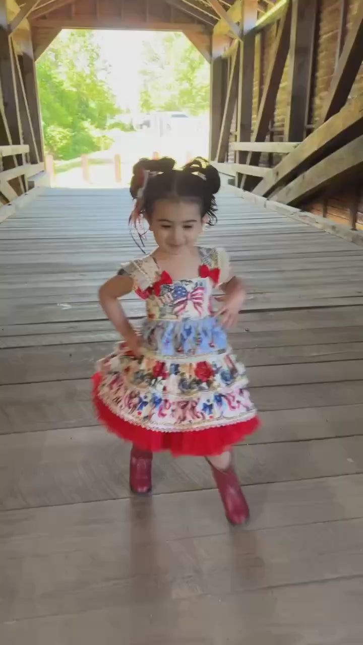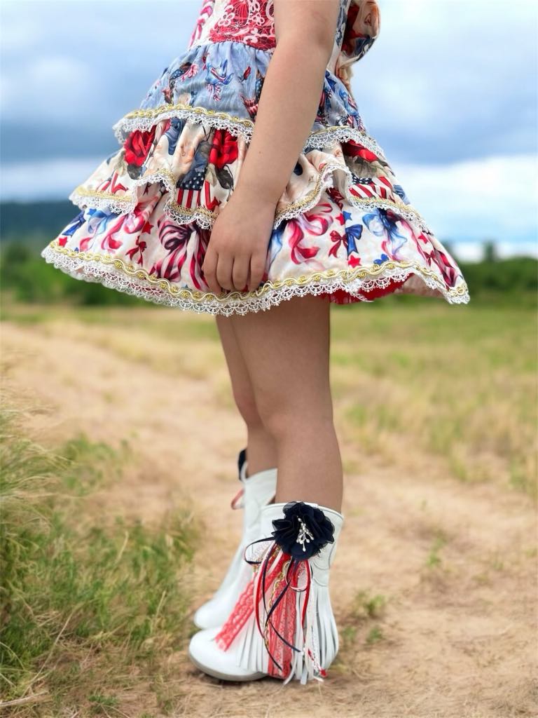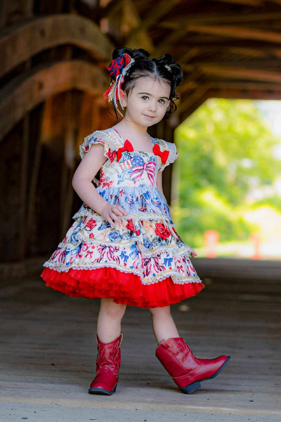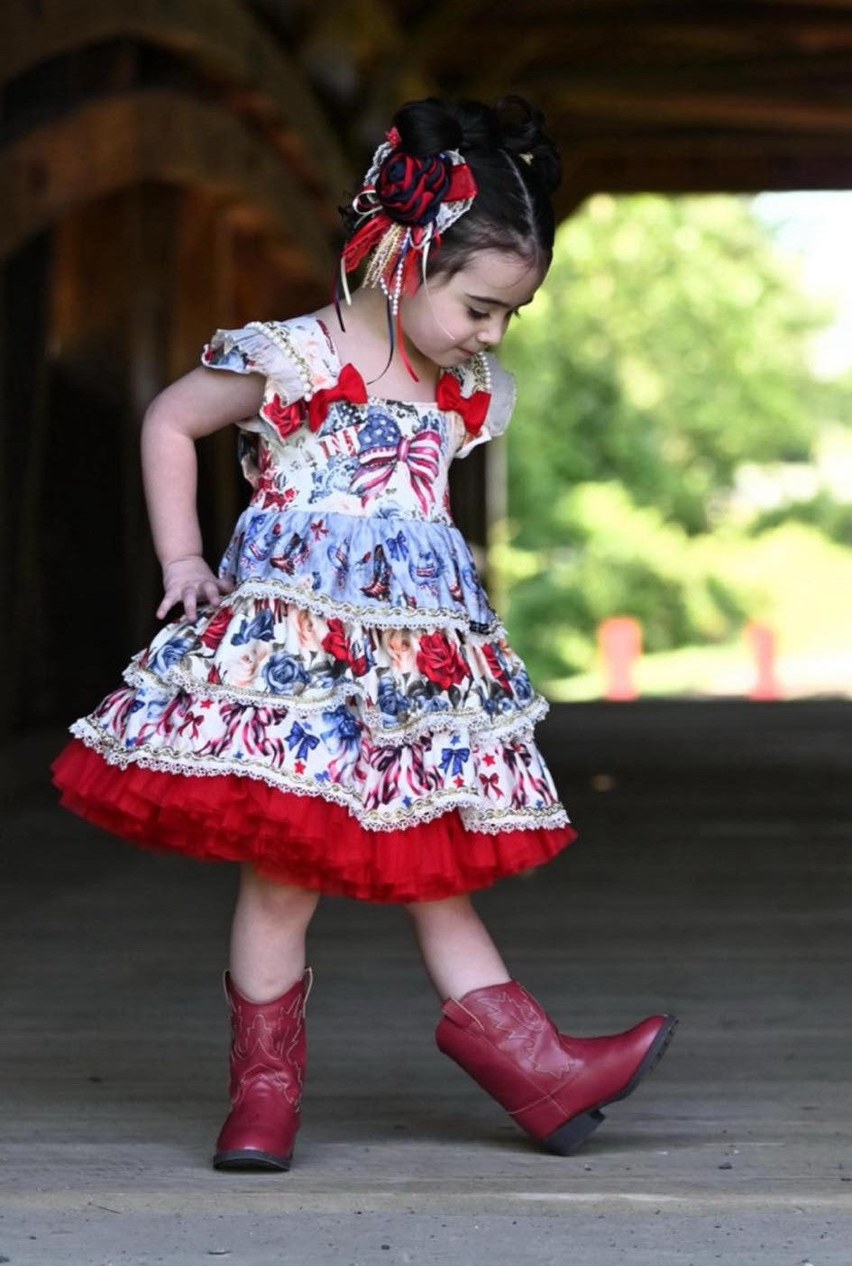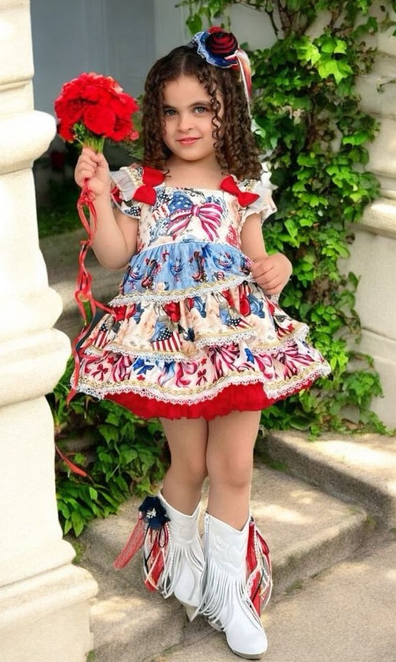Reba by Couture Creations in all her daintiness of with chiffon and pearl flutters and 3 layer ruffles of Boots & Hats, this dress has a flare of daintiness with coordinating florals of Roses, and Patriotic Ribbons & Bows. Each ruffle has a lace edge and is trimmed with Metallic gold trims and topped off with 2 red shoulder bows. The back has a large bow so she looks cute coming or going.