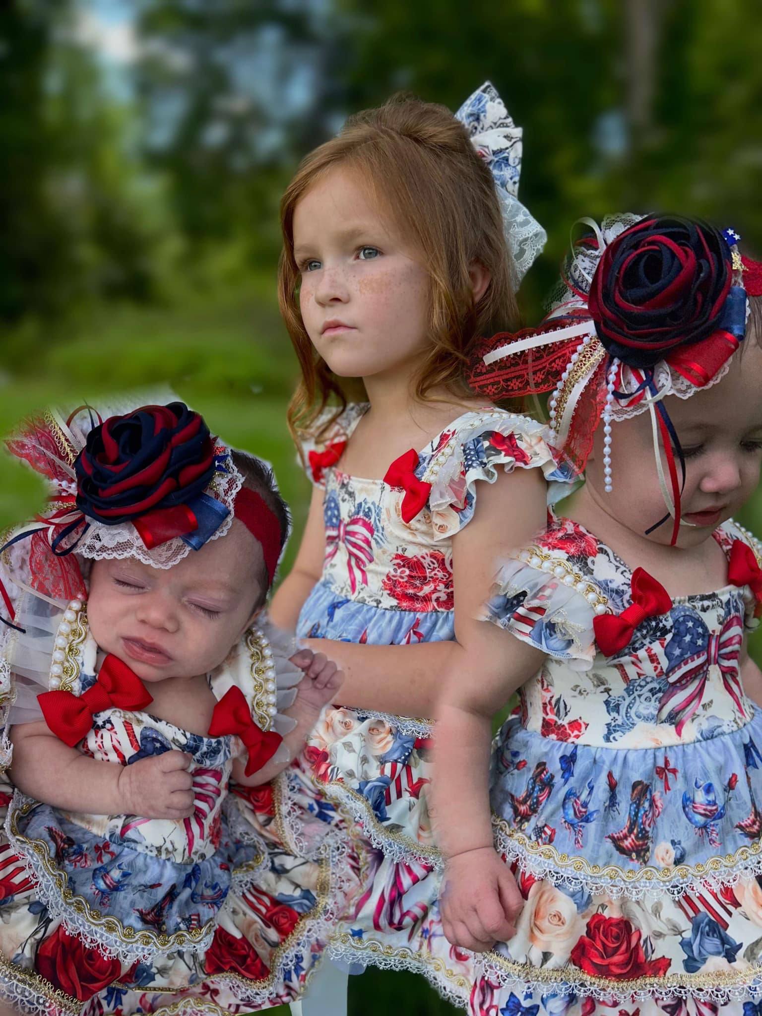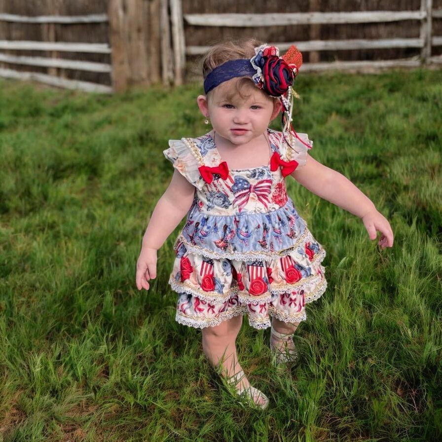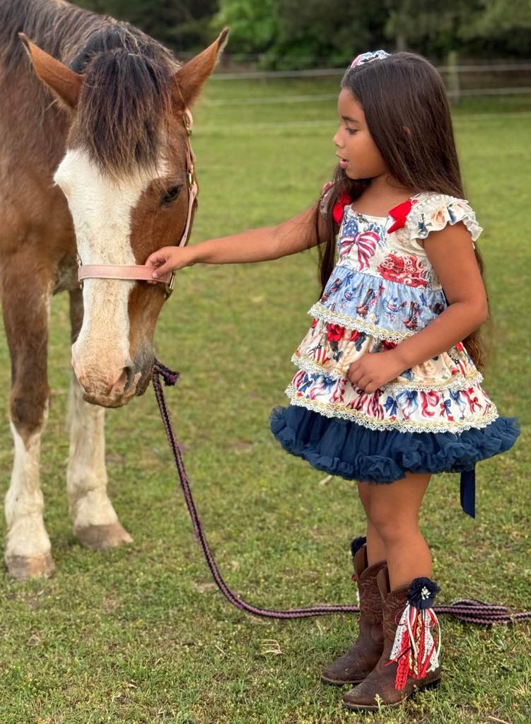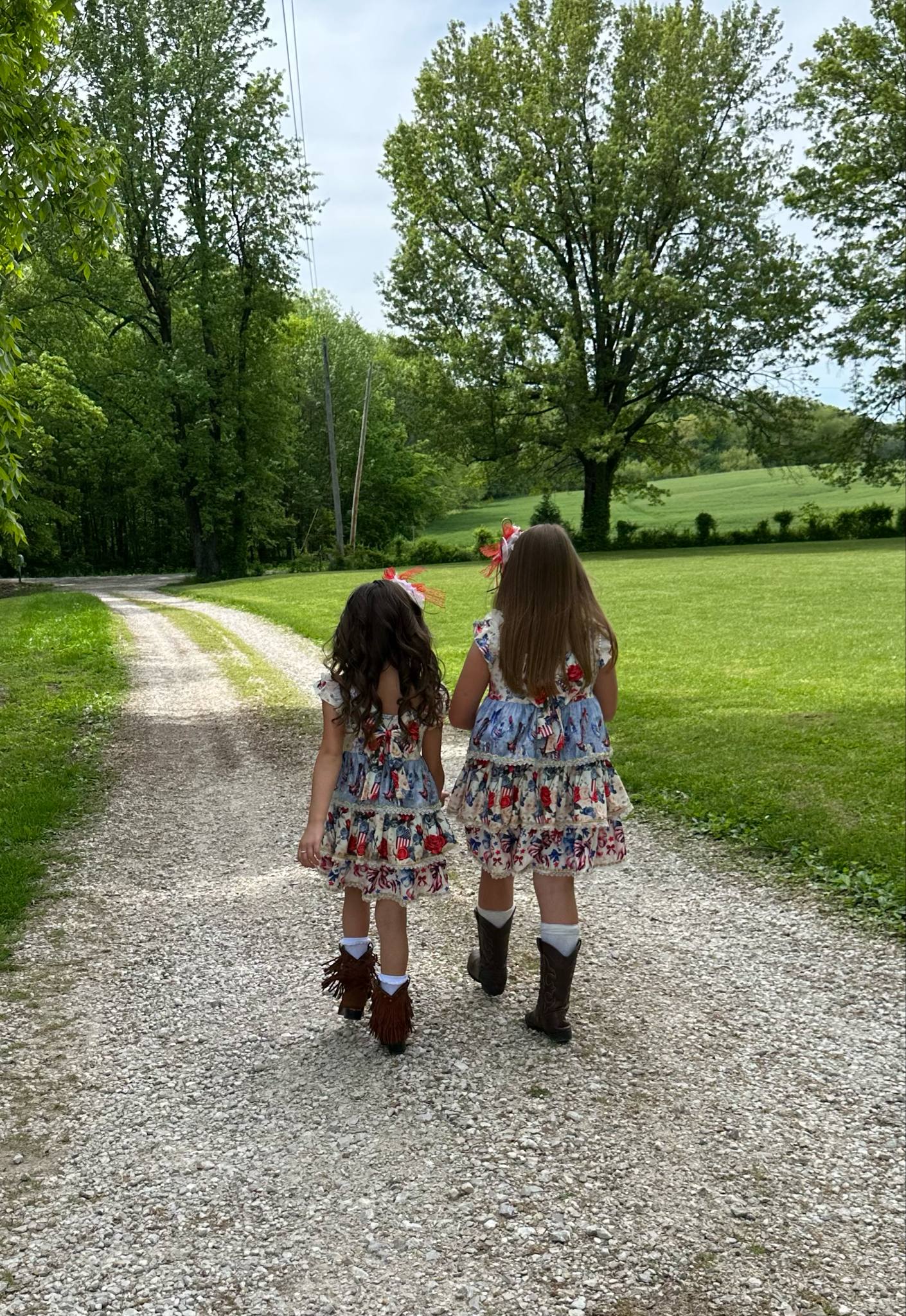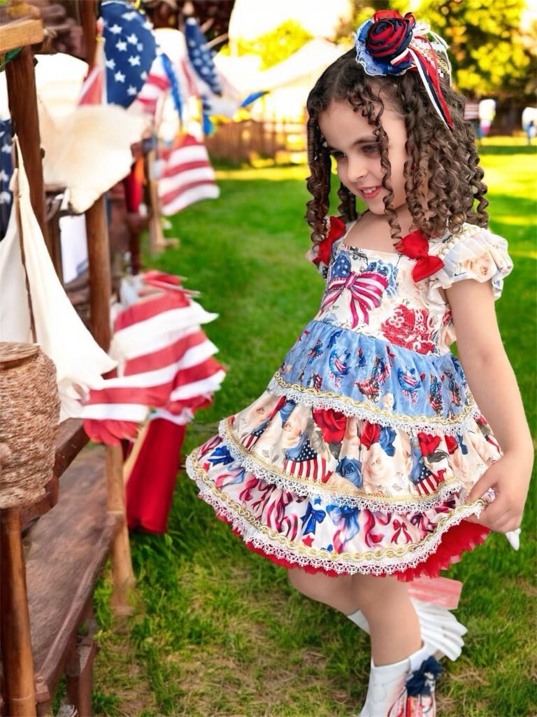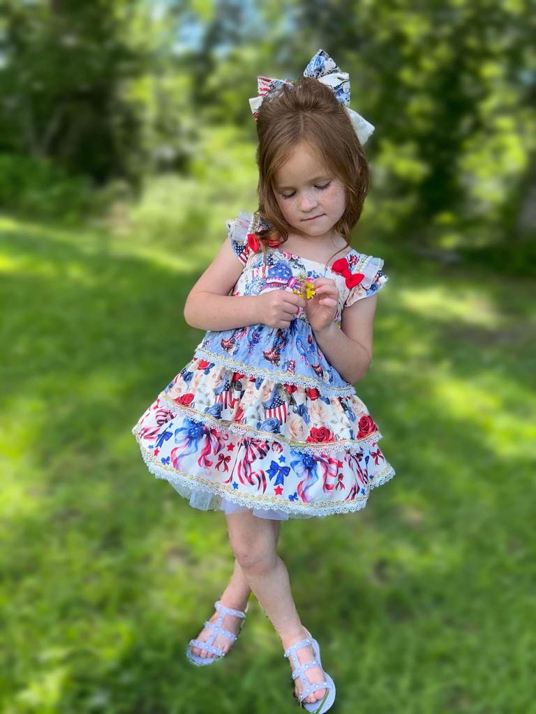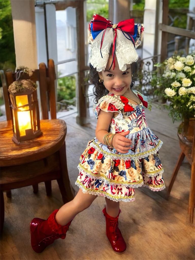 Reba by Couture Creations in all her daintiness of with chiffon and pearl flutters and 3 layer ruffles of Boots & Hats, this dress has a flare of daintiness with coordinating florals of Roses, and Patriotic Ribbons & Bows. Each ruffle has a lace edge and is trimmed with Metallic gold trims and topped off with 2 red shoulder bows. The back has a large bow so she looks cute coming or going.