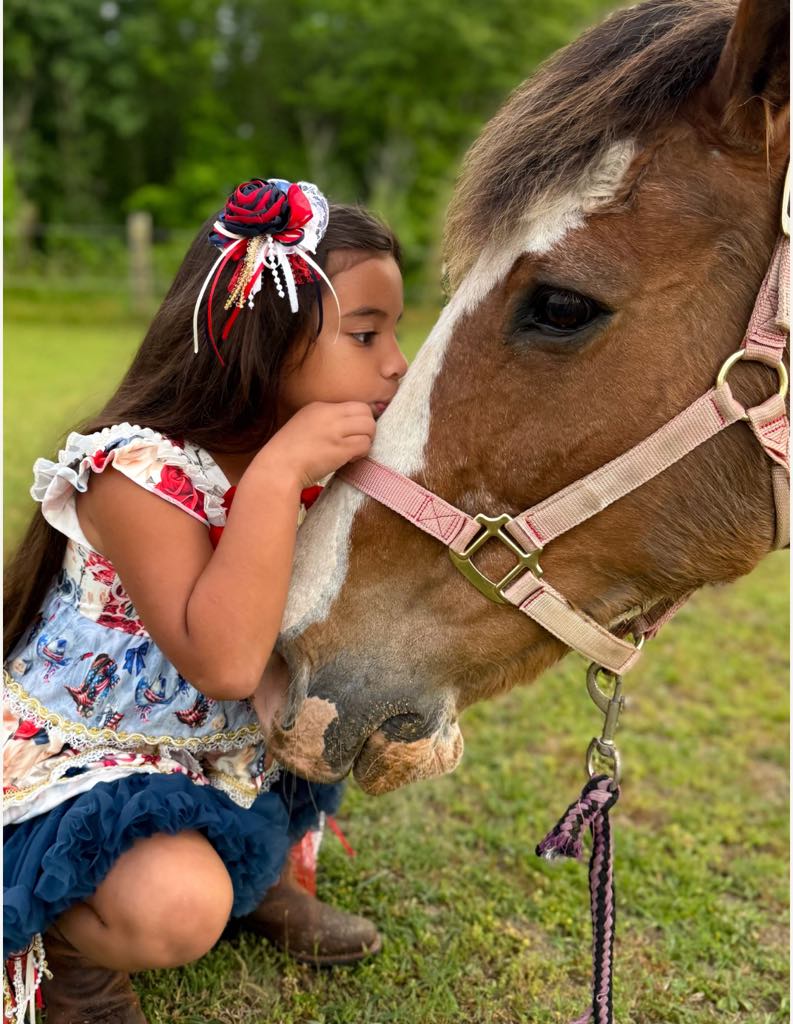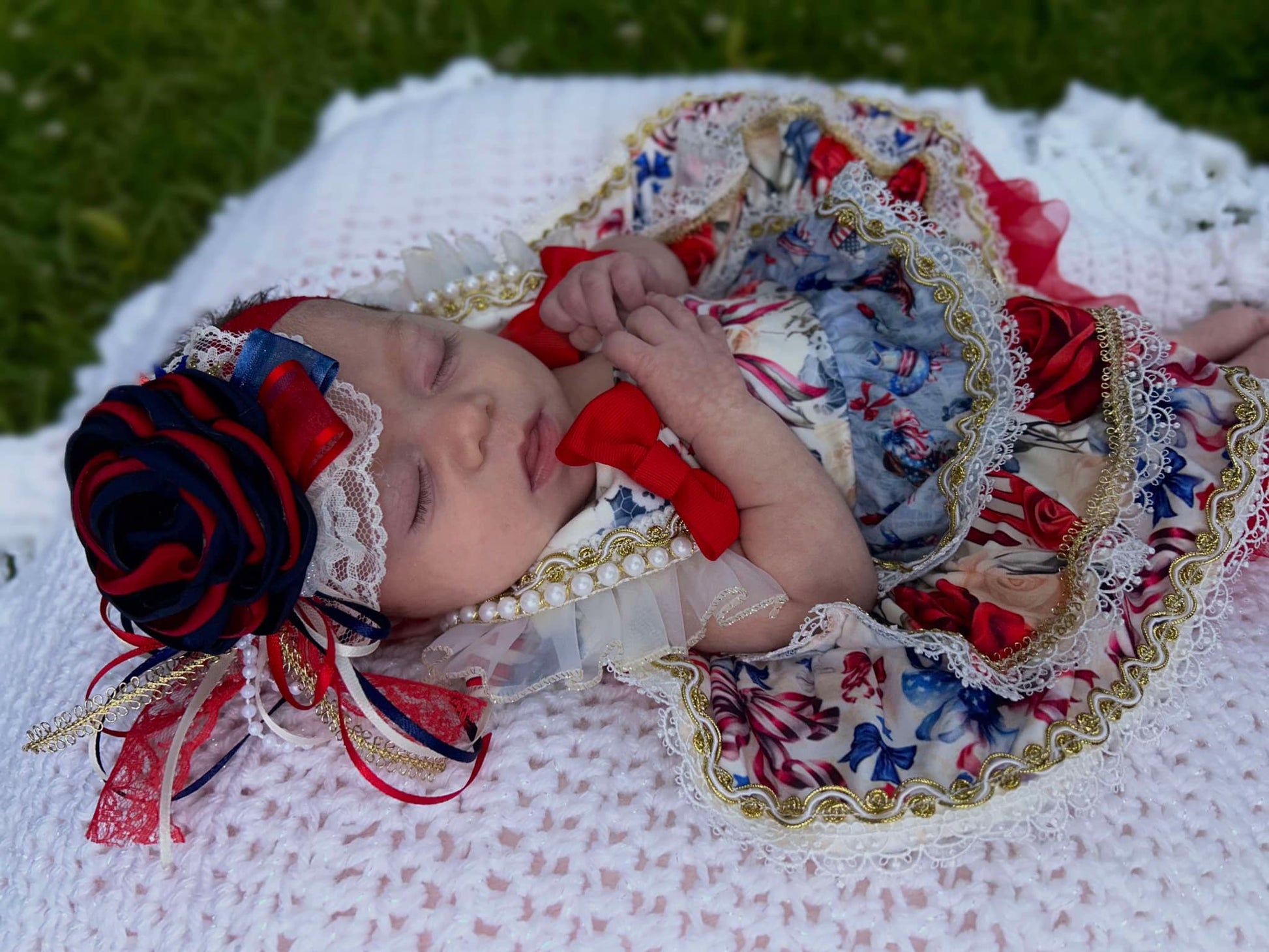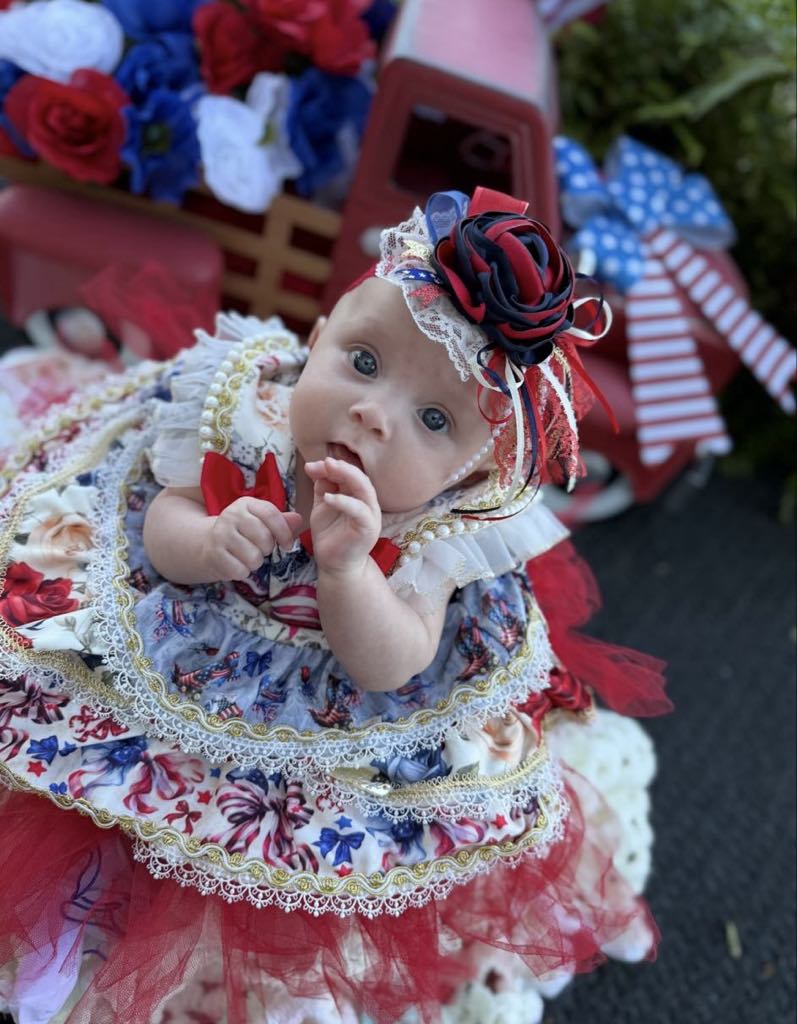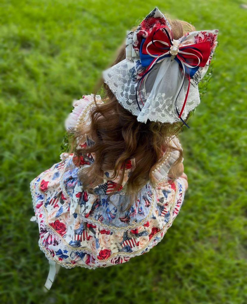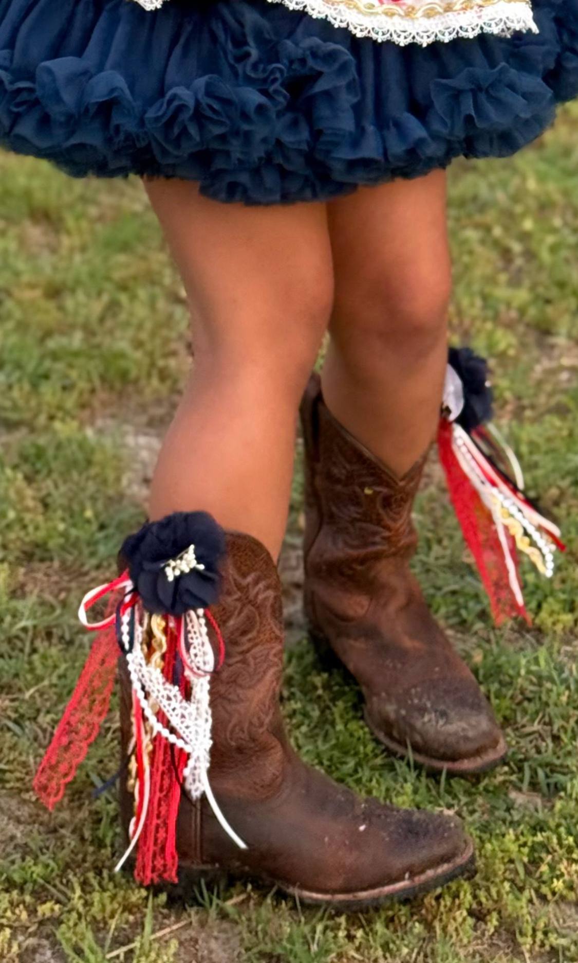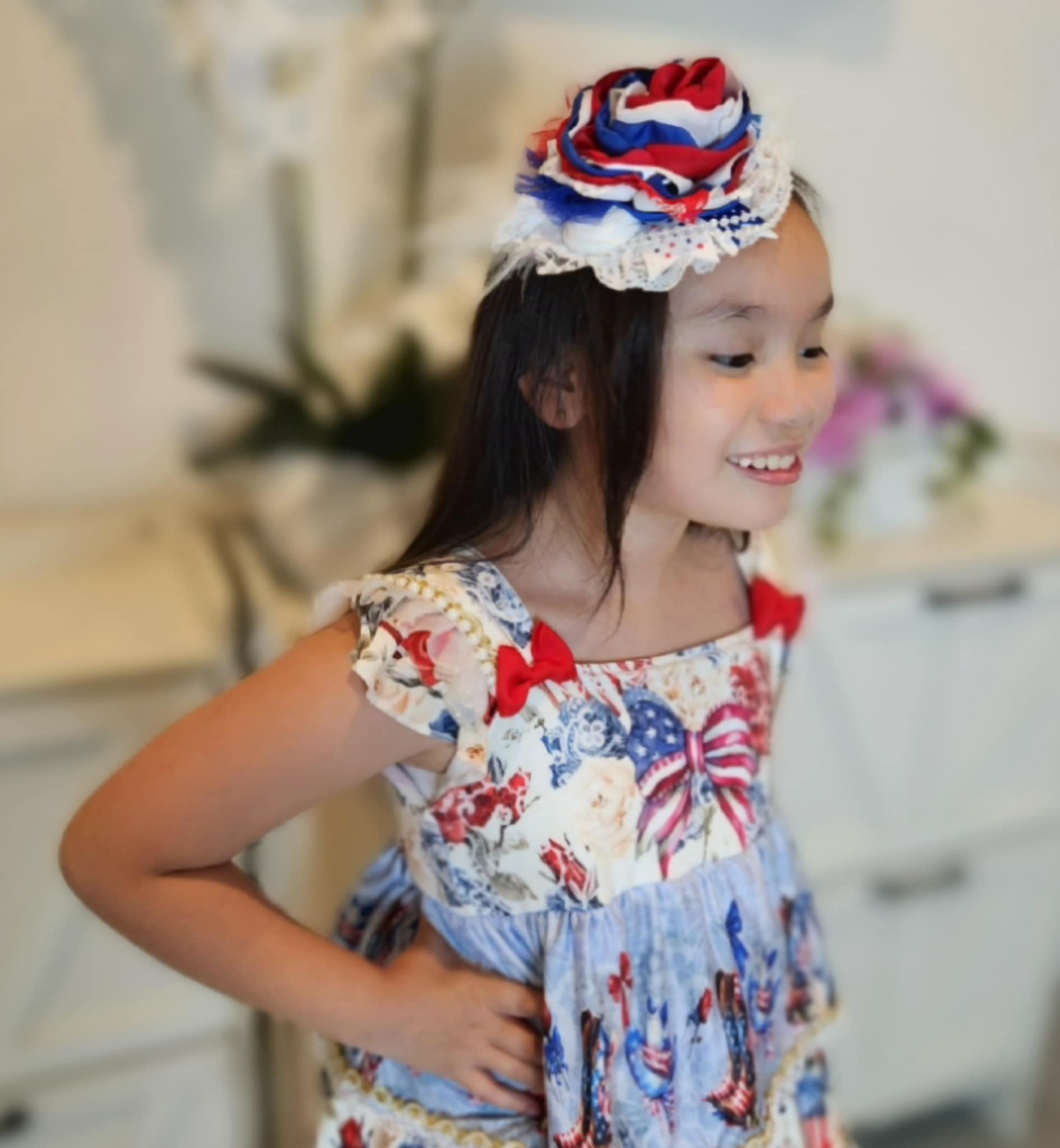 Reba by Couture Creations in all her daintiness of with chiffon and pearl flutters and 3 layer ruffles of Boots & Hats, this dress has a flare of daintiness with coordinating florals of Roses, and Patriotic Ribbons & Bows. Each ruffle has a lace edge and is trimmed with Metallic gold trims and topped off with 2 red shoulder bows. The back has a large bow so she looks cute coming or going.