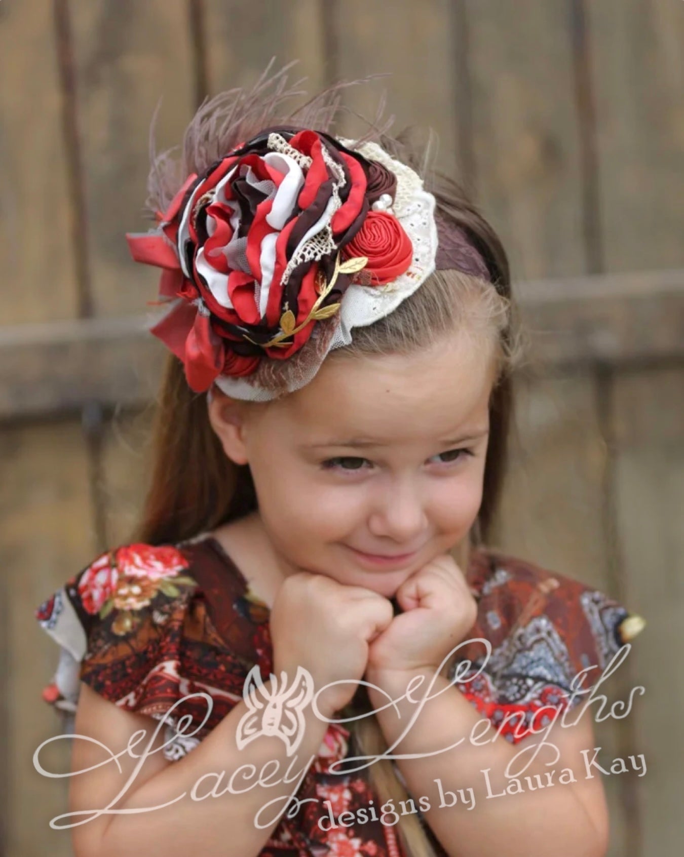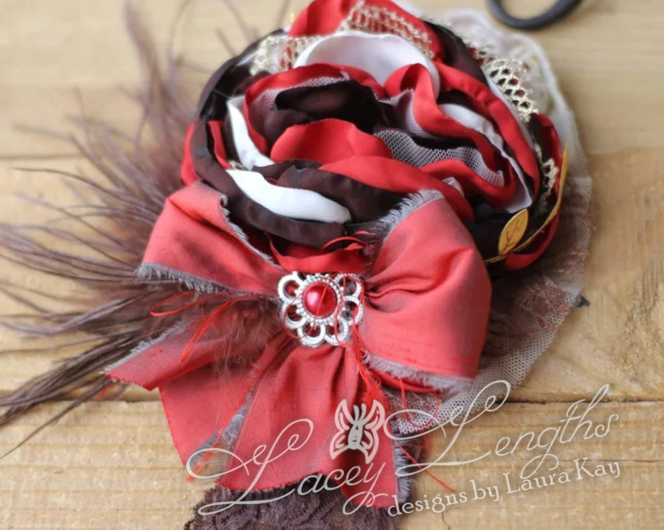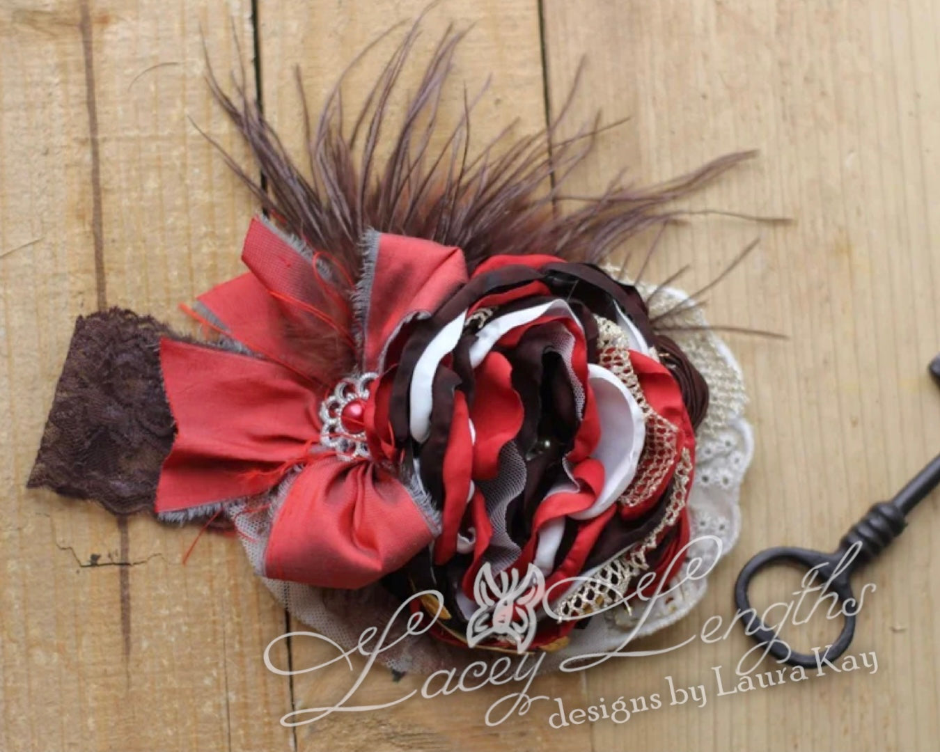 Single bloom, fall colors, rust, cream and brown, with brown ostrich feathers and a brown lace band.