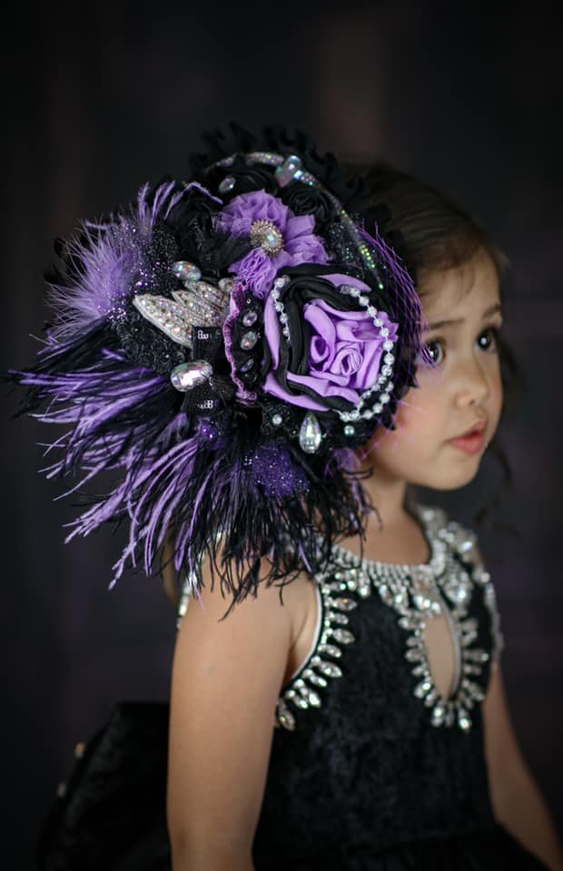 Couture fascinator - handmade singed satin Lacey Lengths bloom, rolled rosettes, tulle, ostrich feathers, rhinestones and gems all around, this is a statement piece and it has details all the way around it so no matter where you photograph there isn't a side not detailed.