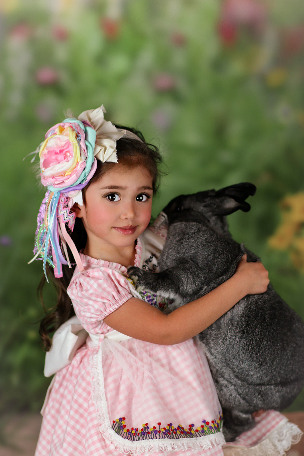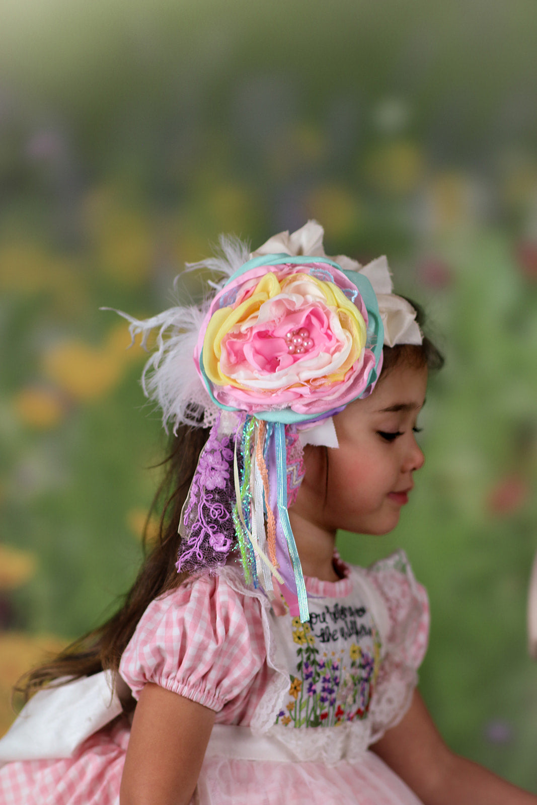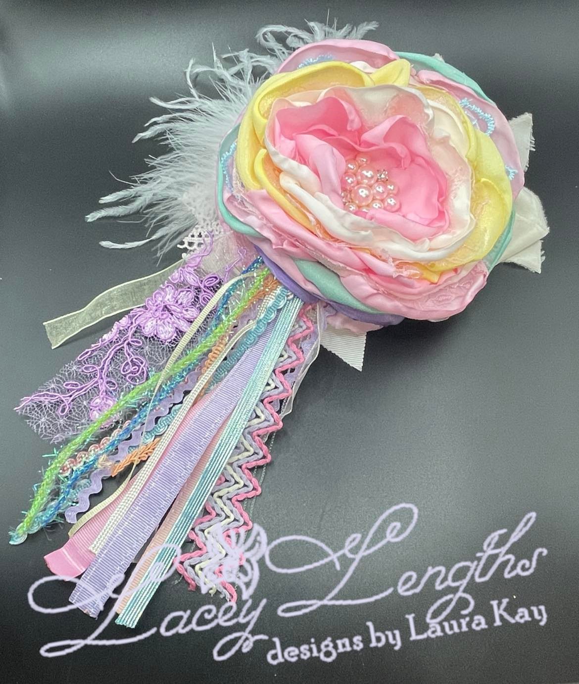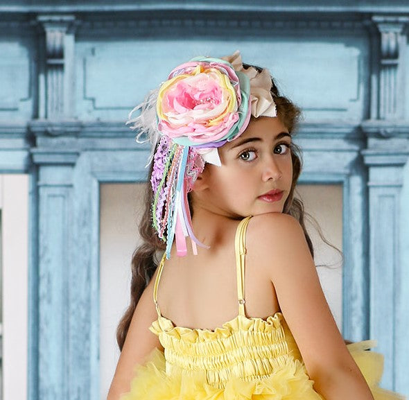 This is a limited release. Get yours before it is gone - Med size (4.5") Pastel variety of Spring time colors with an open bloom that has rhinestones and pearls in the center, white feathers, variety of Spring pastel streamers attached. Pictured on a lace headband but can be on a hard band, nylon, elastic band or clip.