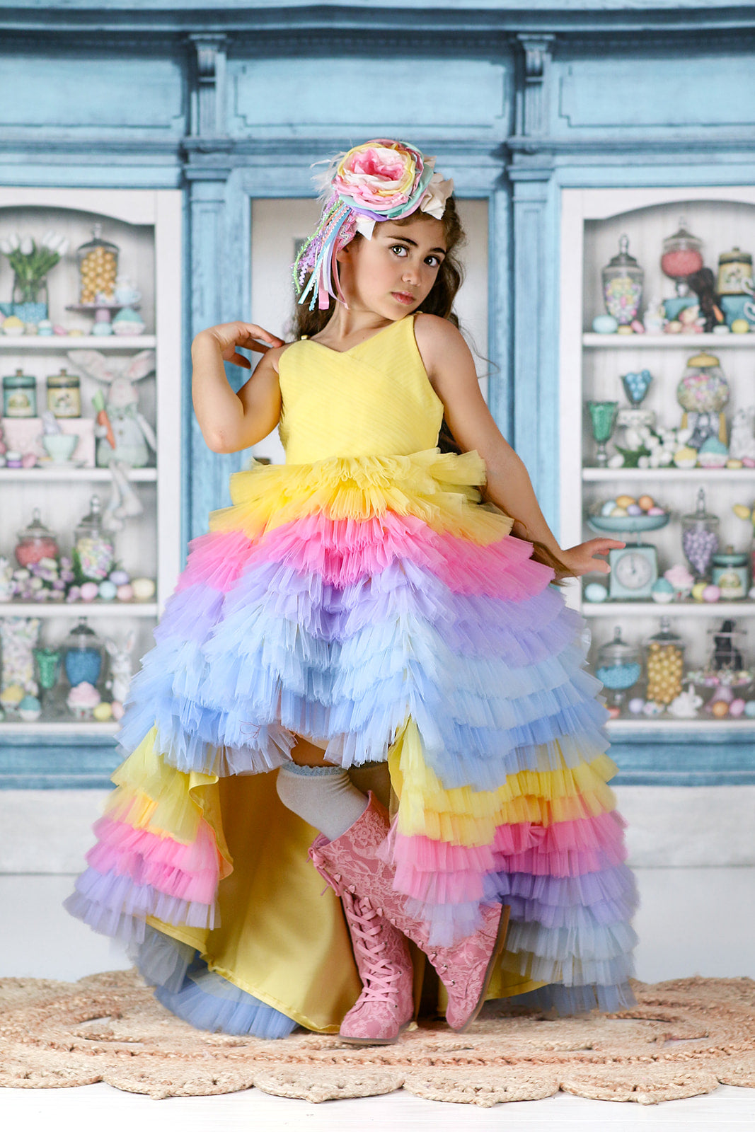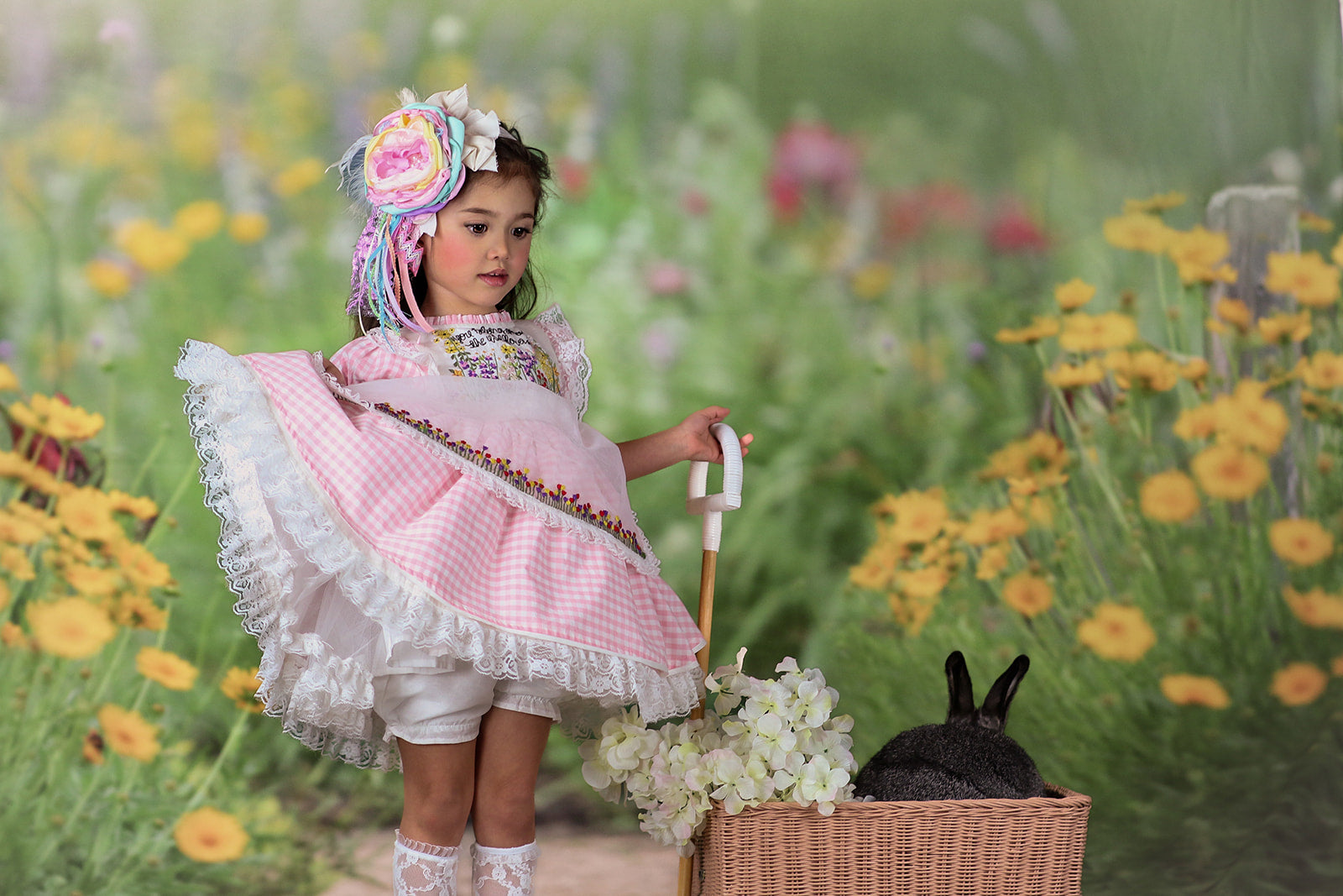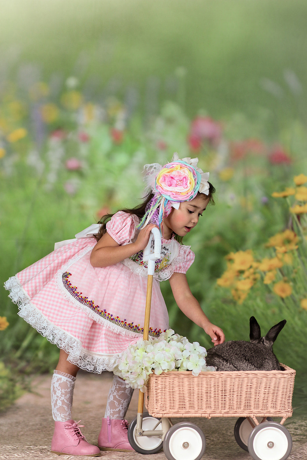 This is a limited release. Get yours before it is gone - Med size (4.5") Pastel variety of Spring time colors with an open bloom that has rhinestones and pearls in the center, white feathers, variety of Spring pastel streamers attached. Pictured on a lace headband but can be on a hard band, nylon, elastic band or clip.