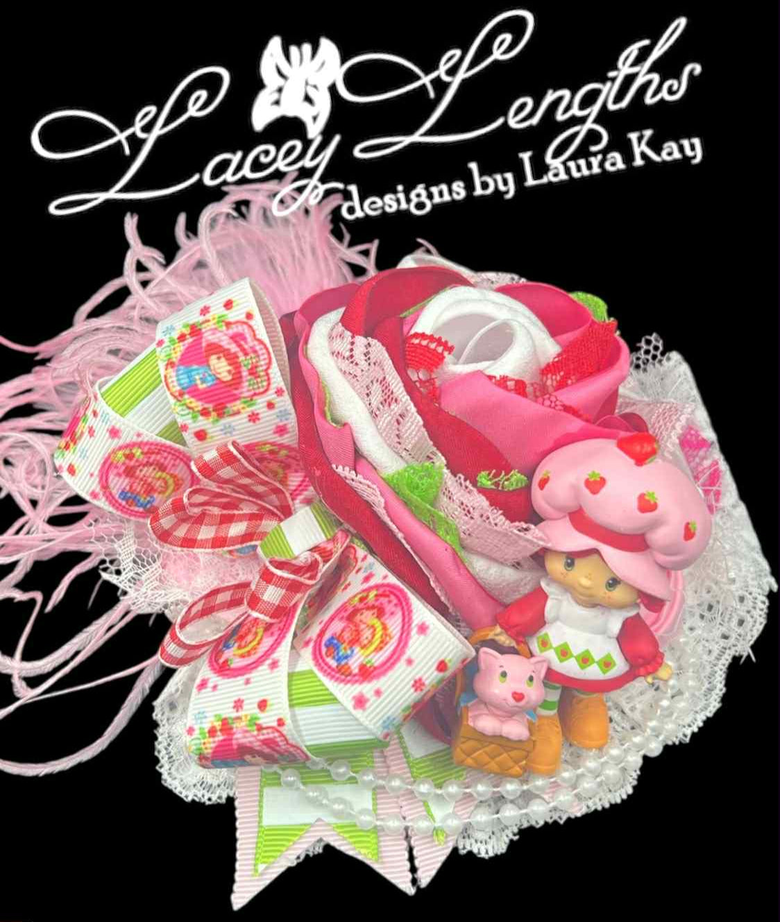 Each is dressed with more lace, pearls, printed ribbons, and has a strawberry print bow on the side. Each comes with a figurine , Strawberry Shortcake has an option of a resin flatback.
