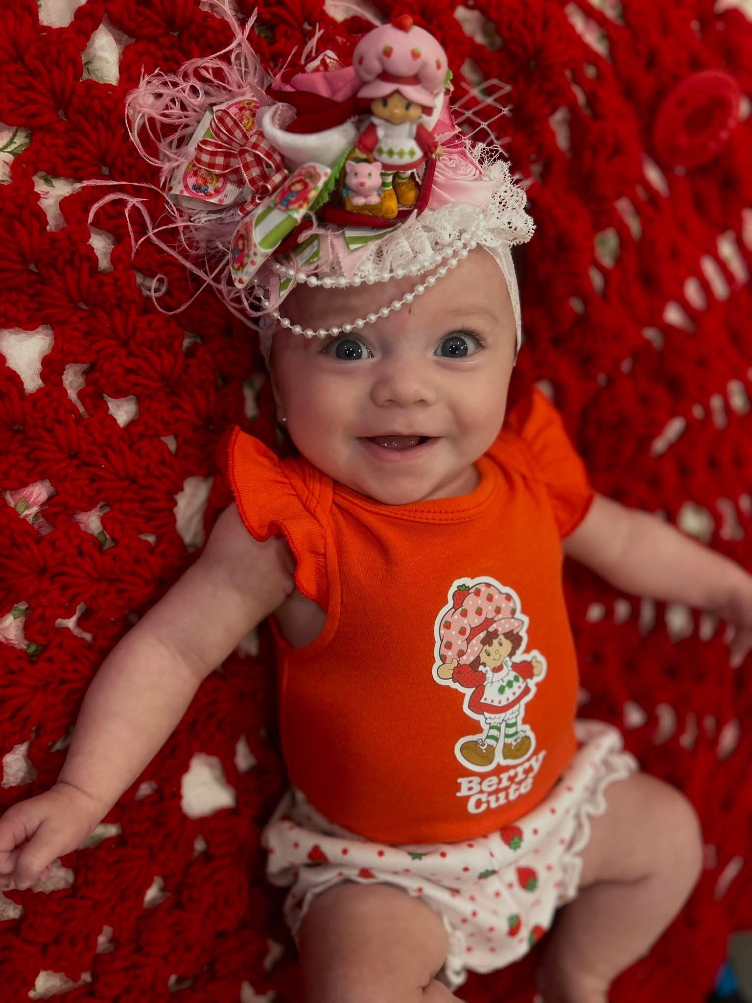 Strawberry Shortcake: red, pink, and white bloom layered with green, pink, and red lace