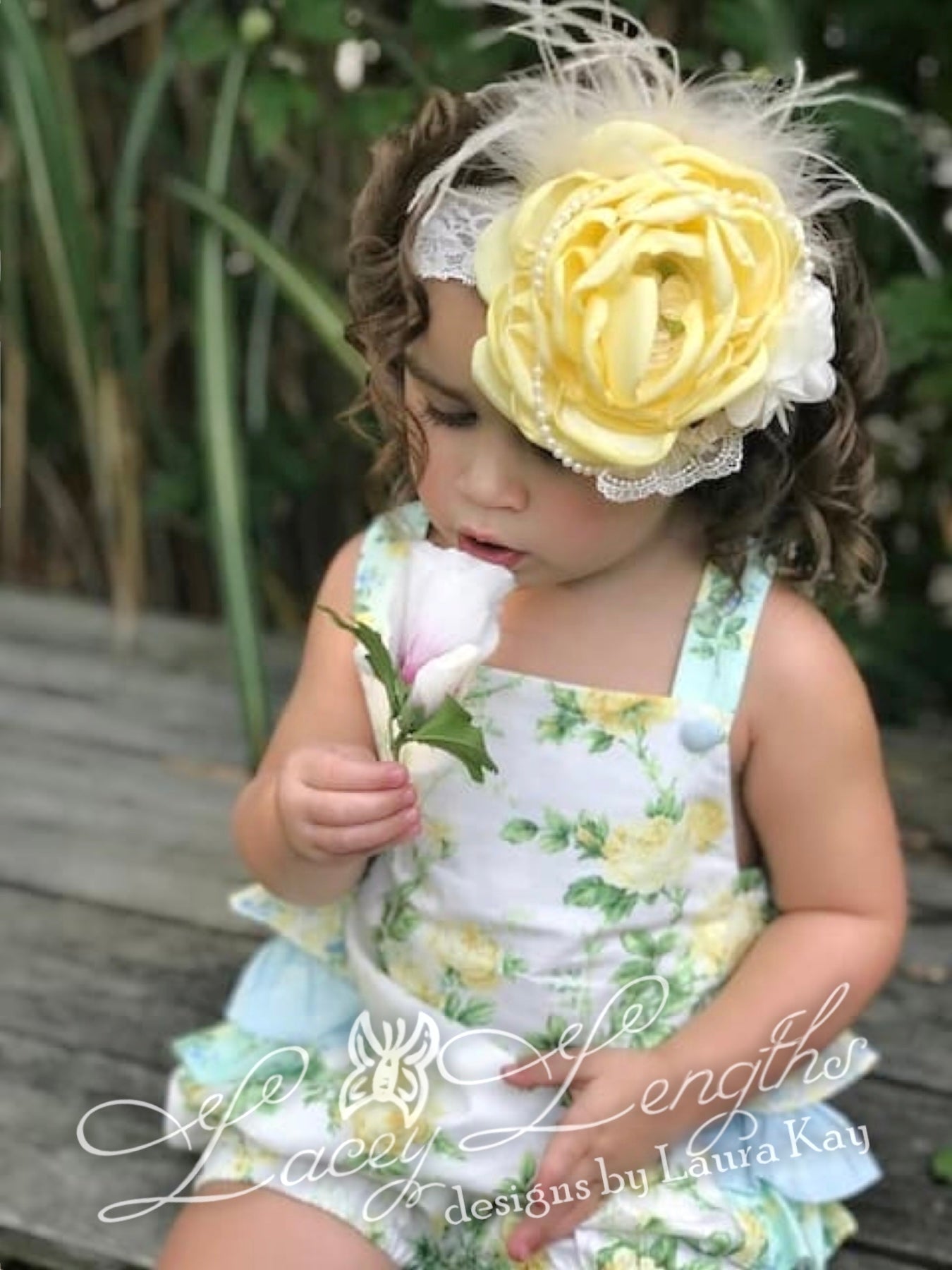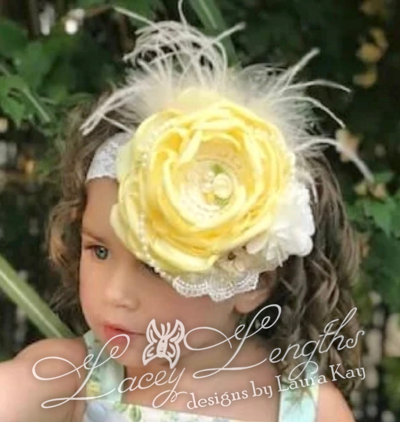 Large single yellow bloom with a delicate center, with chiffon side flower, pearls, ivory ostrich feathers on a lace band.