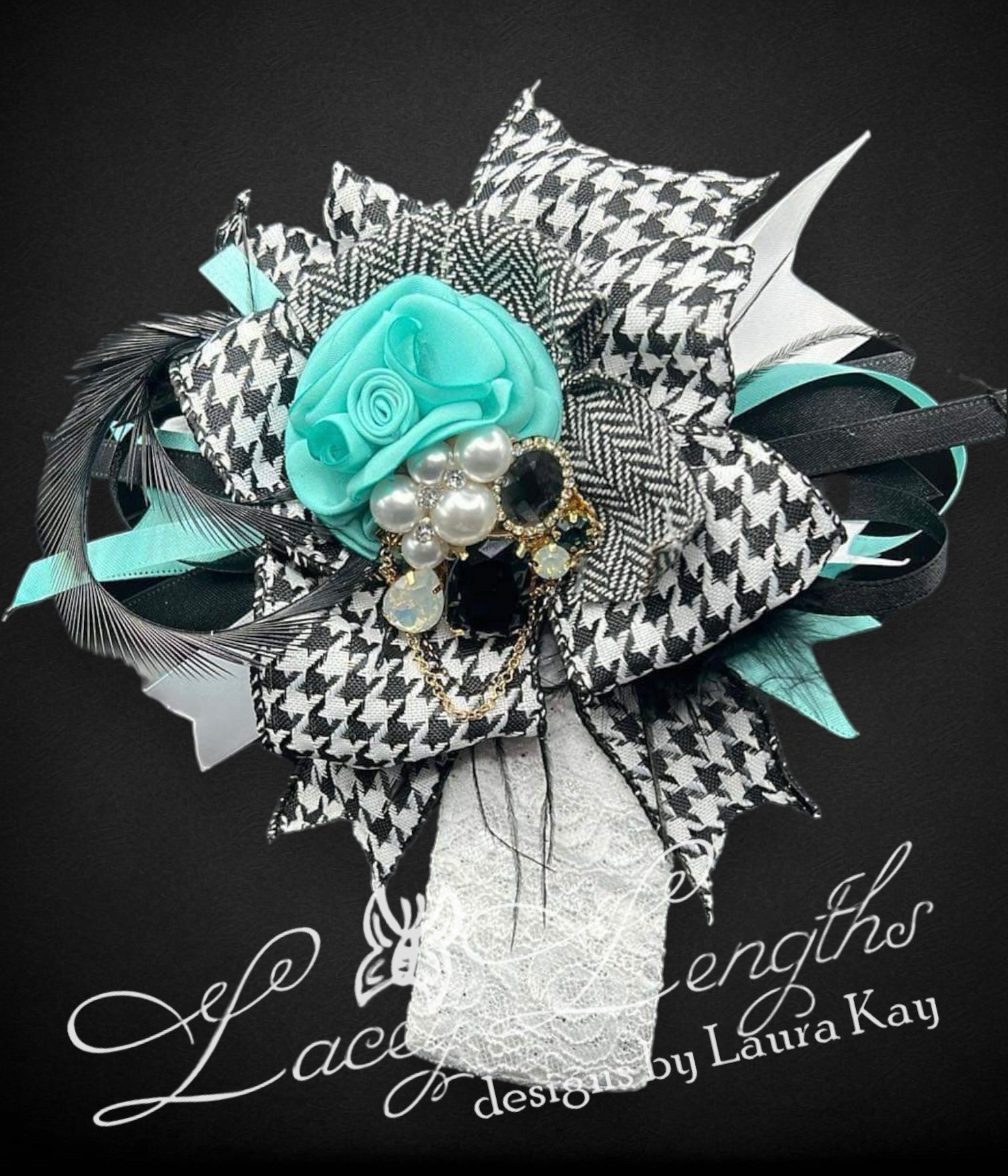 Itty bitty (2.5” petals) bloom with rosebud center made of Tiffany blue satin fabric. Lots of black and white houndstooth ribbon and dressed with rhinestones and pears. This piece goes well with any fashion. Can be on a lace band, hard band, elastic band or alligator clips.