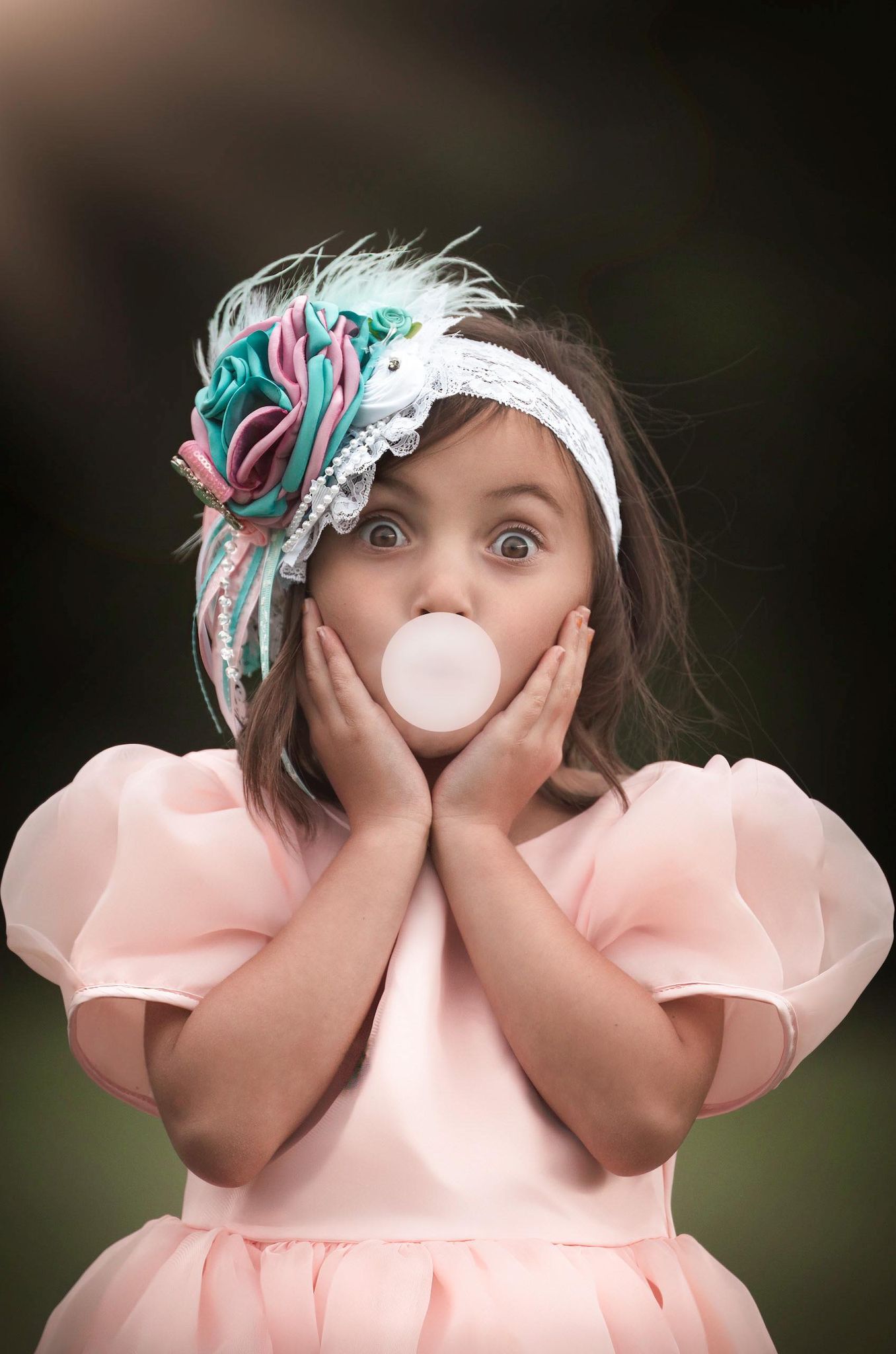 Medium size (4.5") petals of vibrant turquoise and pink satin fabrics. This 'rosebud center' style bloom sits atop white lace, strand pearls, and rolled rosettes. It is decorated with lots of turquoise and pink ribbons, feathers, and topped off with a beautiful rhinestone brooch.